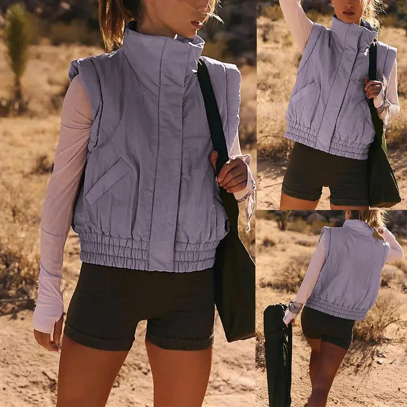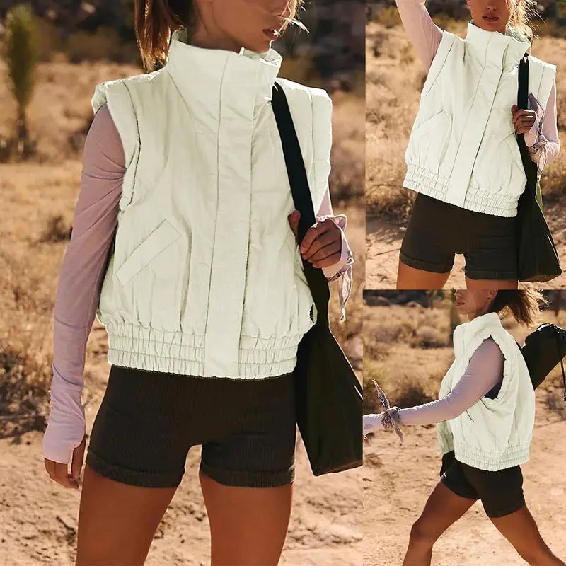 This relaxed-fit, cropped puffer vest hits just above the natural waist, featuring a high-neck design. It offers a chic, modern look perfect for layering. The stand collar and solid color enhance its versatile appeal. Ideal for women seeking a stylish yet practical outfit piece.