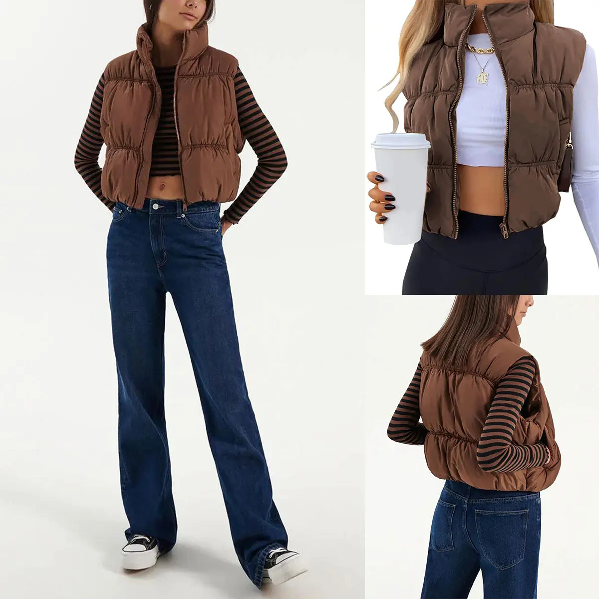 This stylish cropped puffer vest is designed with high-quality materials to keep you cozy and warm. The outer shell is made from 100% nylon, known for its durability and water-resistant properties, while the lining is 100% polyester, offering a soft feel against the skin. The combination of these fabrics ensures a lightweight yet effective insulation layer, making it the perfect choice for chilly fall and winter days.