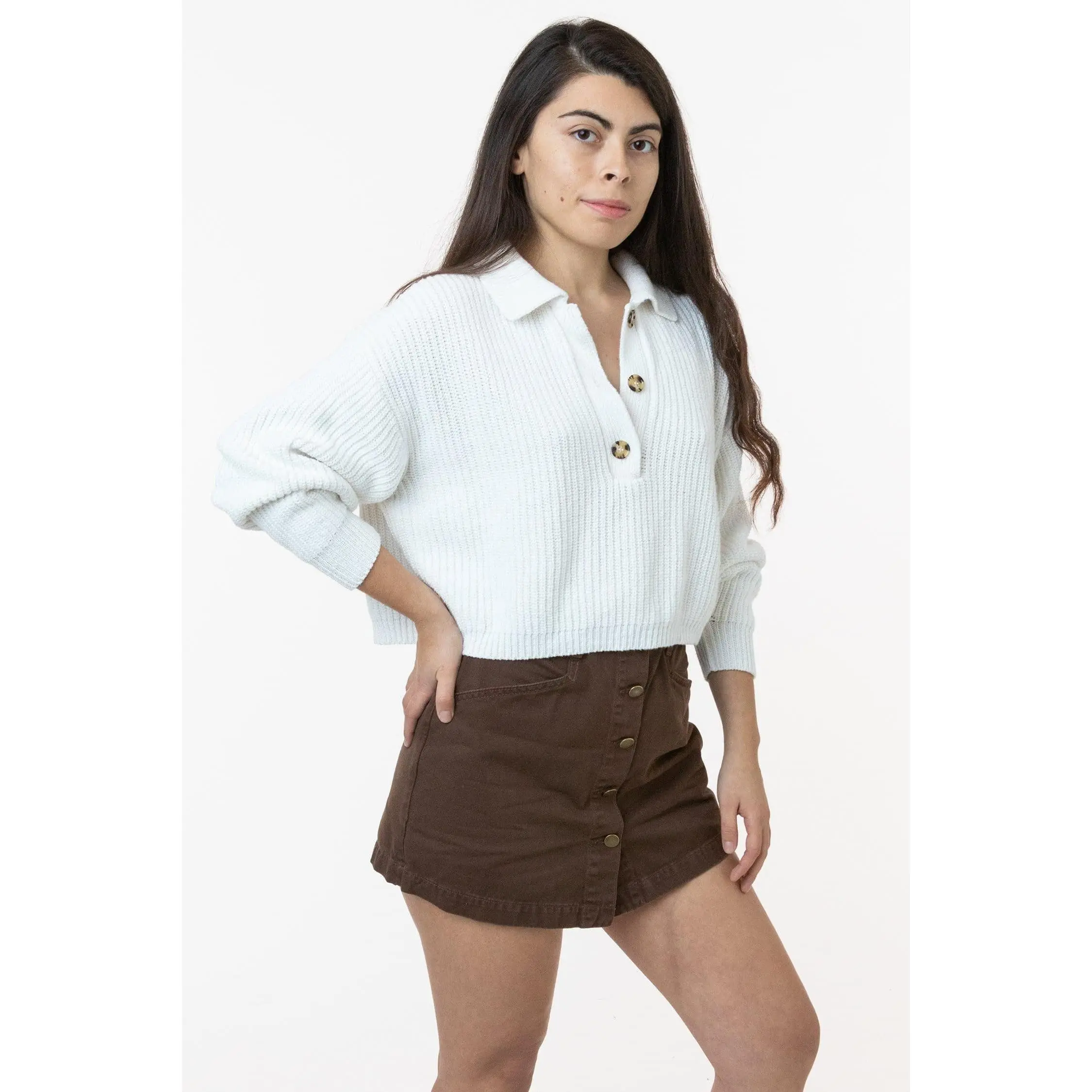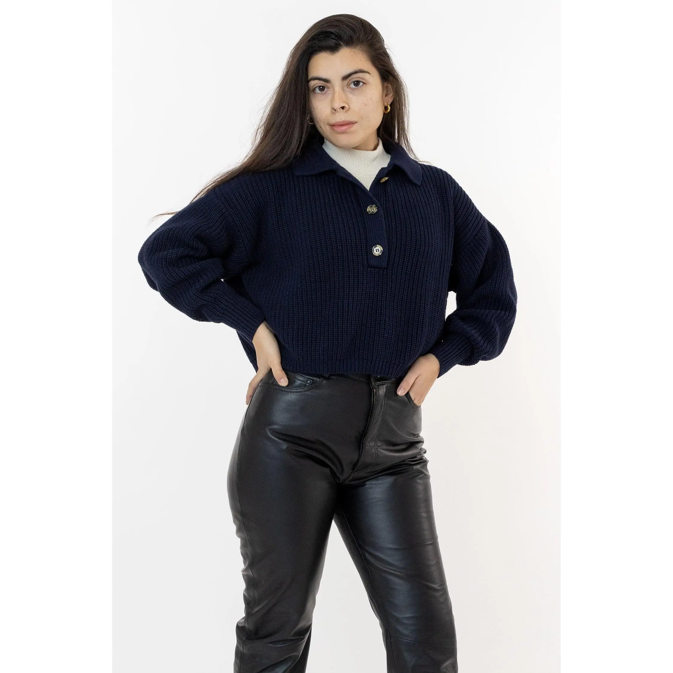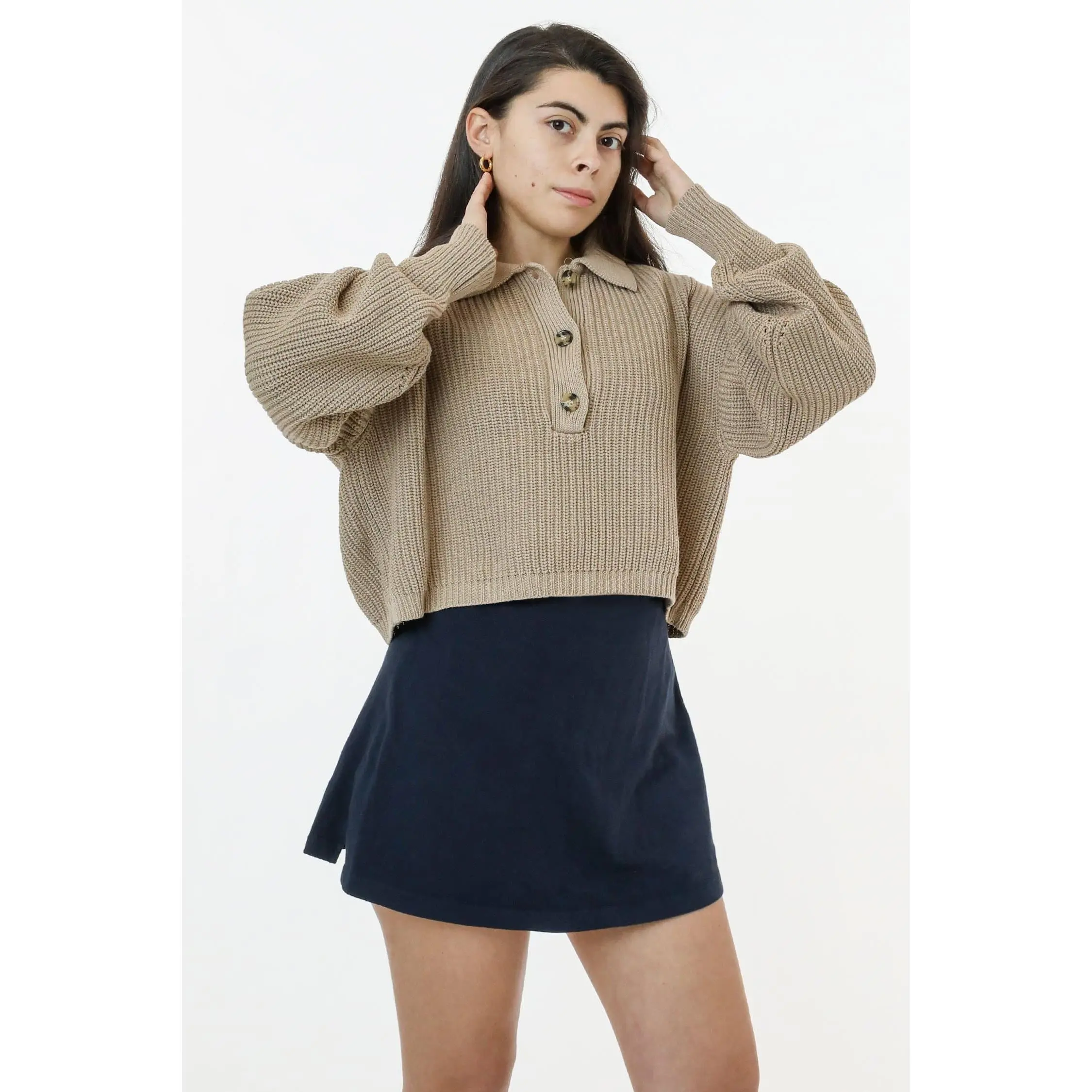 A classic boxy, pullover sweater with a polo collar– knit just like our bestselling fisherman sweater. This cropped style right at the waist, has dropped shoulders and three tortoiseshell buttons for a feminine touch. These cardigans are garment dyed to match your favorite styles. Pair this style with jeans for a laid back look, or our skirts and shorts ready for spring. This sweater is made of 100% cotton.This item is a garment dye product. Garment dye items can be distinguished by “GD” at the end of their style number, and will not match piece dye items (items without “GD” at the end of their style number). To learn more about the garment dye process, please click here.Made in Los Angeles, Calif. by workers earning fair wages.• Unisex• Made in Los Angeles, Calif.• 100% Shrink Free Garment dye Cotton