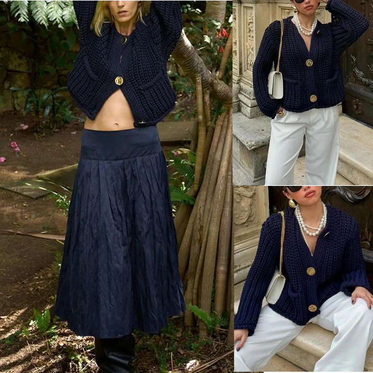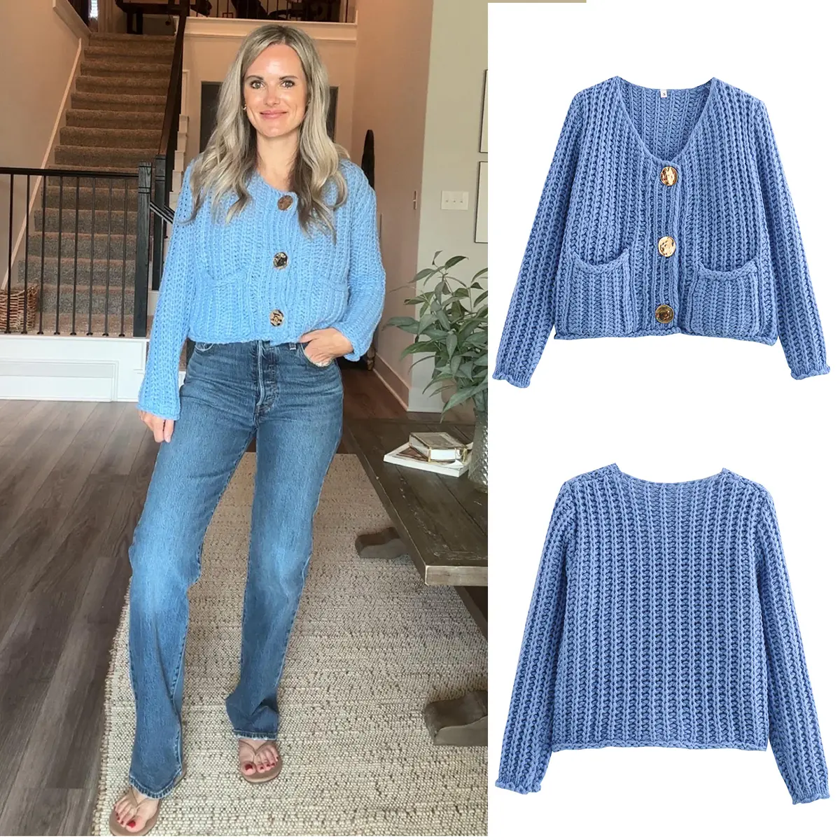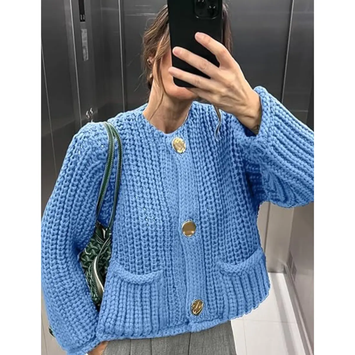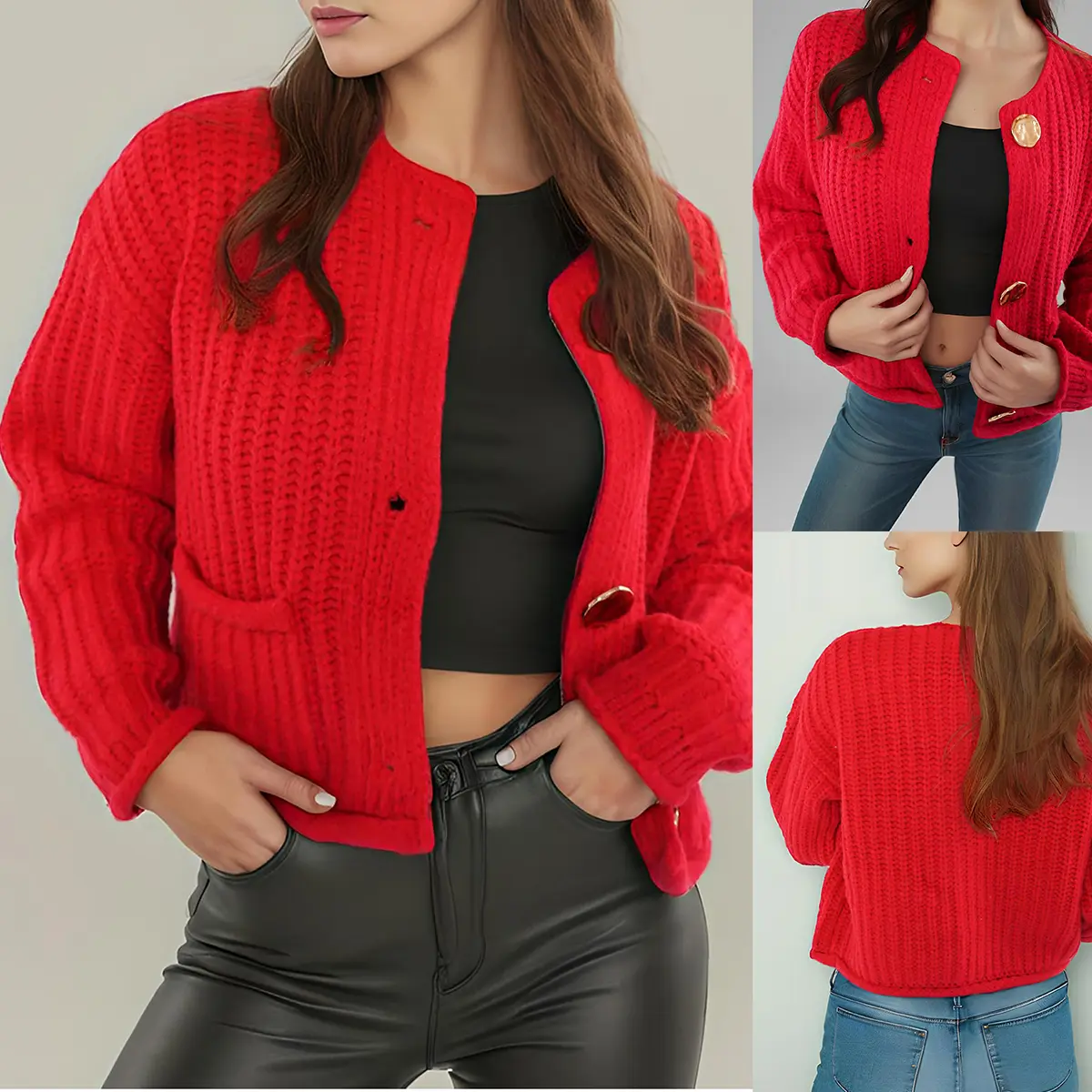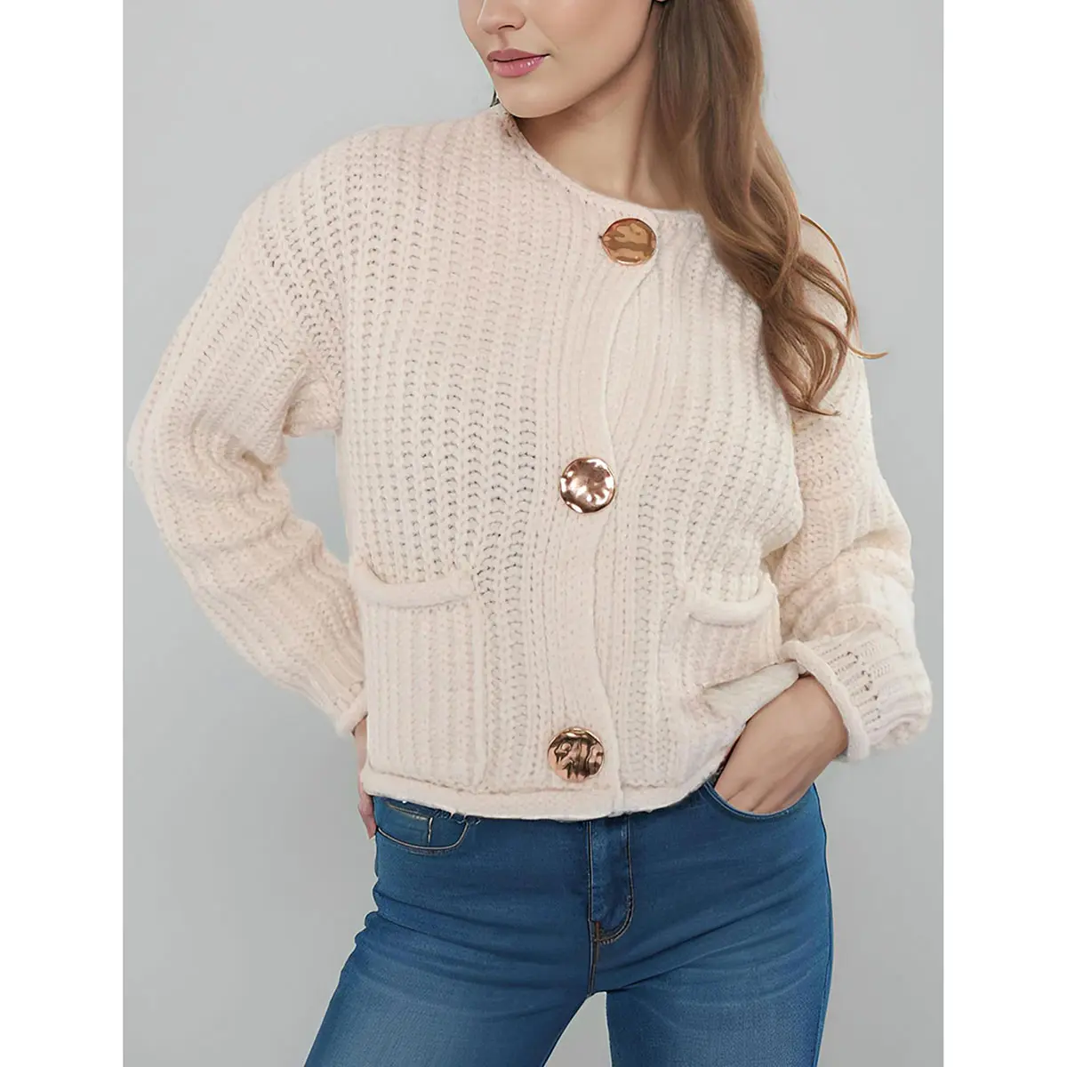 ·Feature: Vintage gold buttons front, two front pockets, cropped length, full sleeves, classical round neck, ribbed knit cuffs and hemline, chunky knitted design