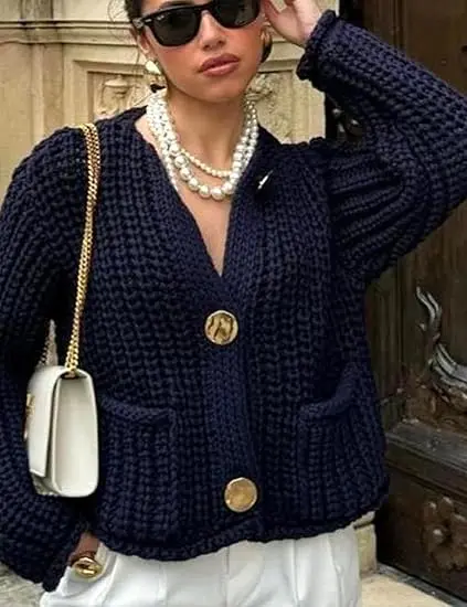 ·Style: Fashion chic sweater carigan for women, unique button pattern for a chic look, timeless elegance of chunky navy knit sweater cardigan, fall sweater with pockets