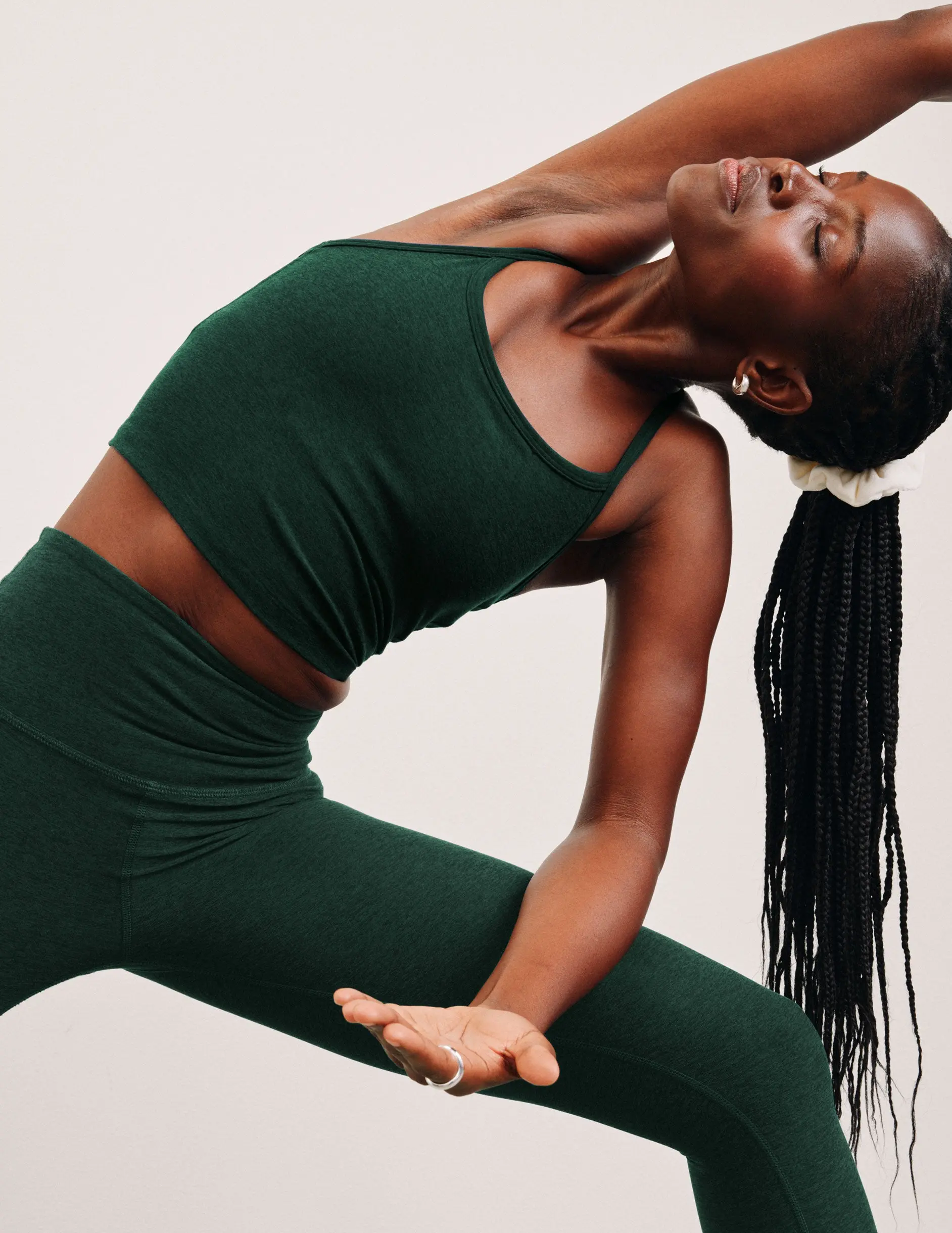 Perfect tank! Beautifully soft, thick, and stretchy material. Not too cropped, covers stomach but not too long. Love the higher coverage top for working out. Flattering racer back straps. Will be buying more with their matching biker shorts!