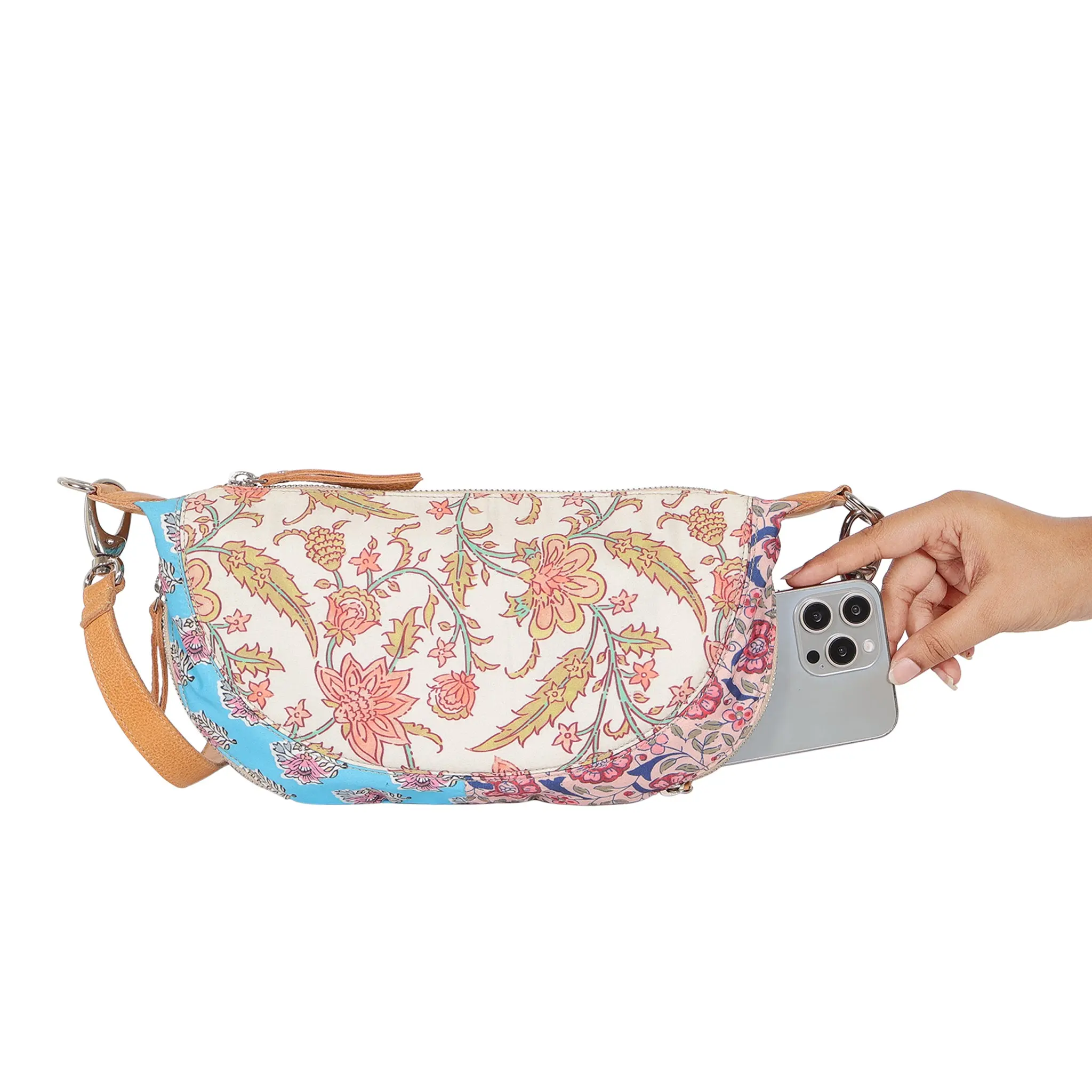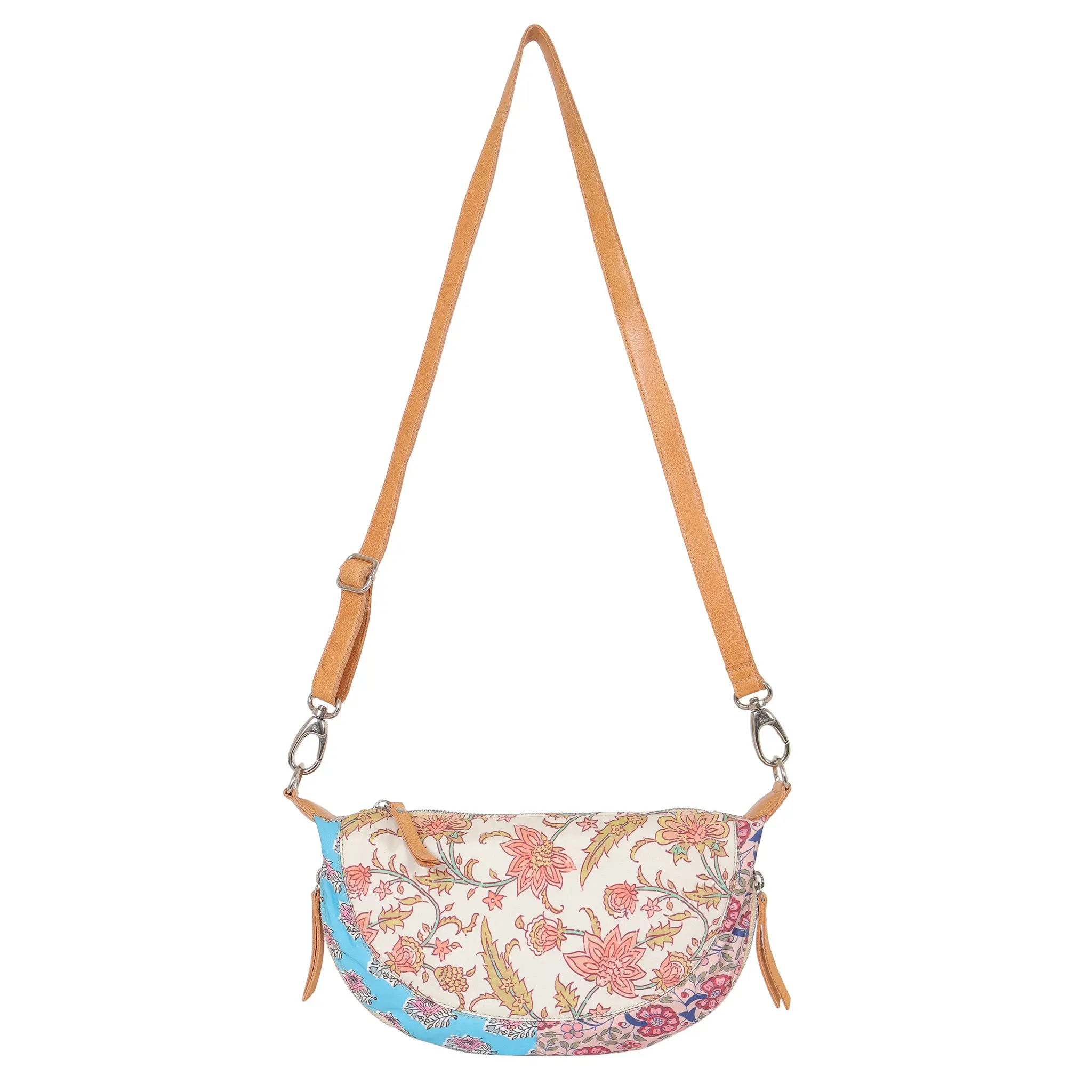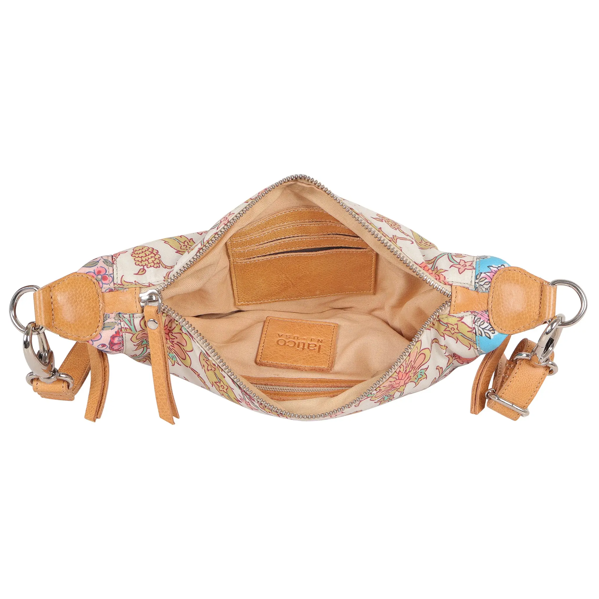 Handcrafted in small batches by skilled artisans in South America and India—never mass-produced. Each bag showcases unique natural variations in grain and shading that only the highest-quality leather can provide. Floral patchwork features a fabric floral pattern.