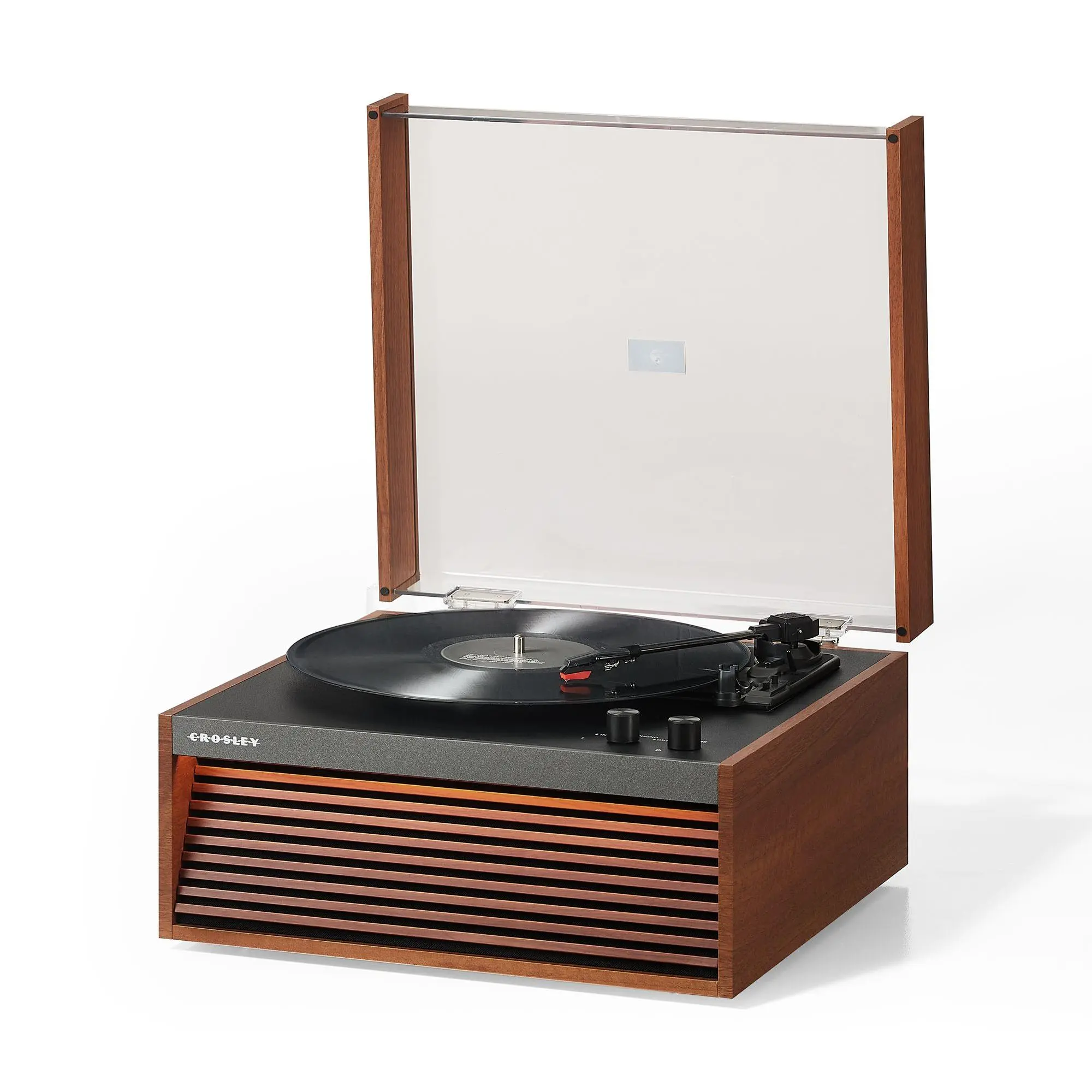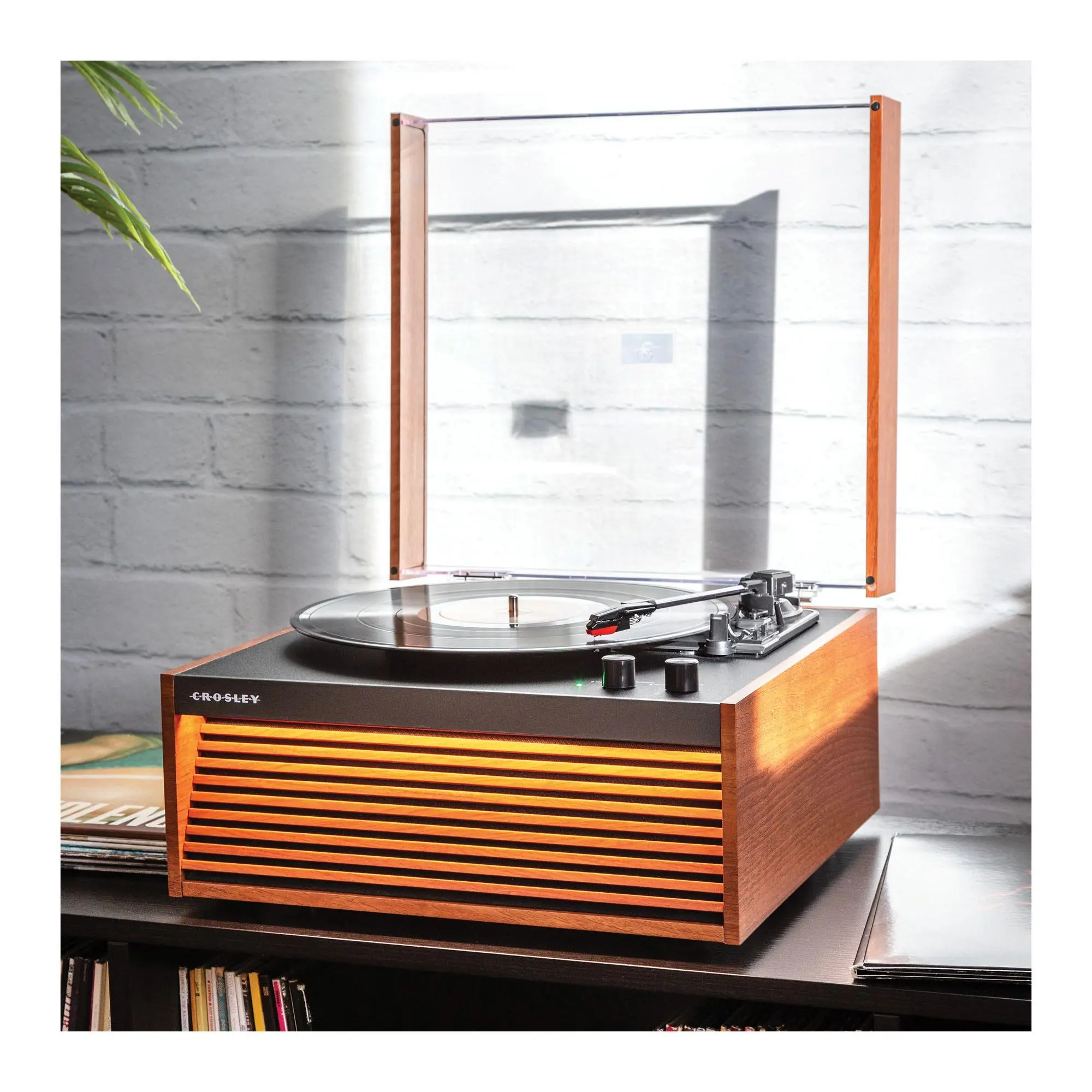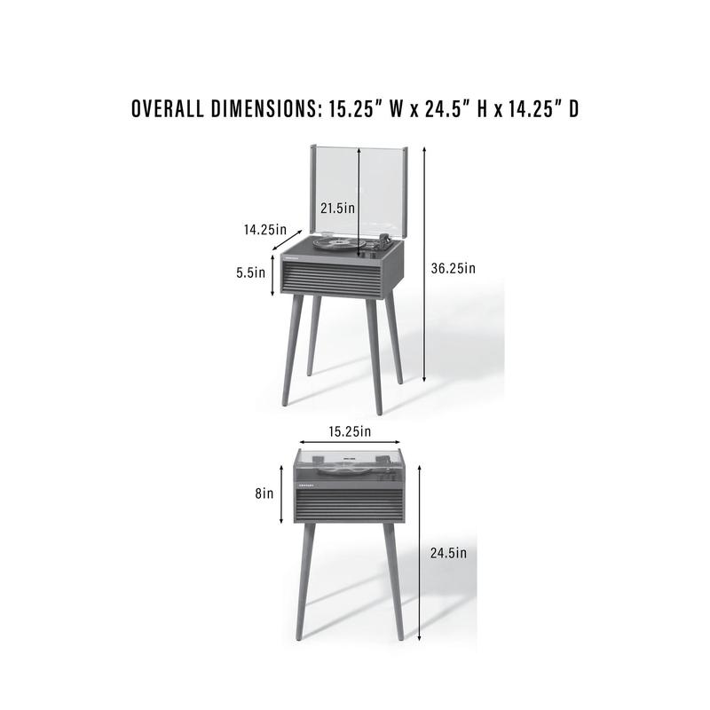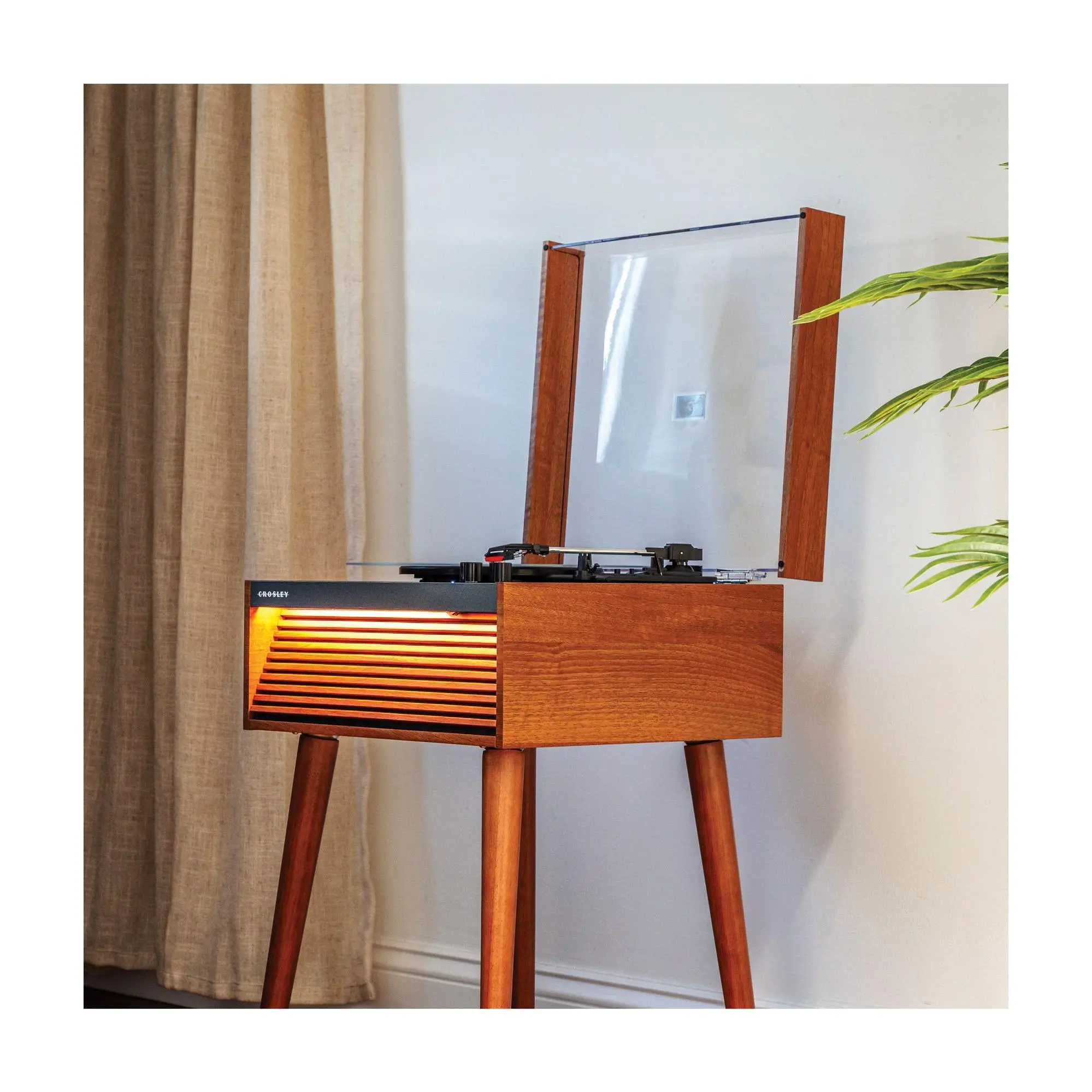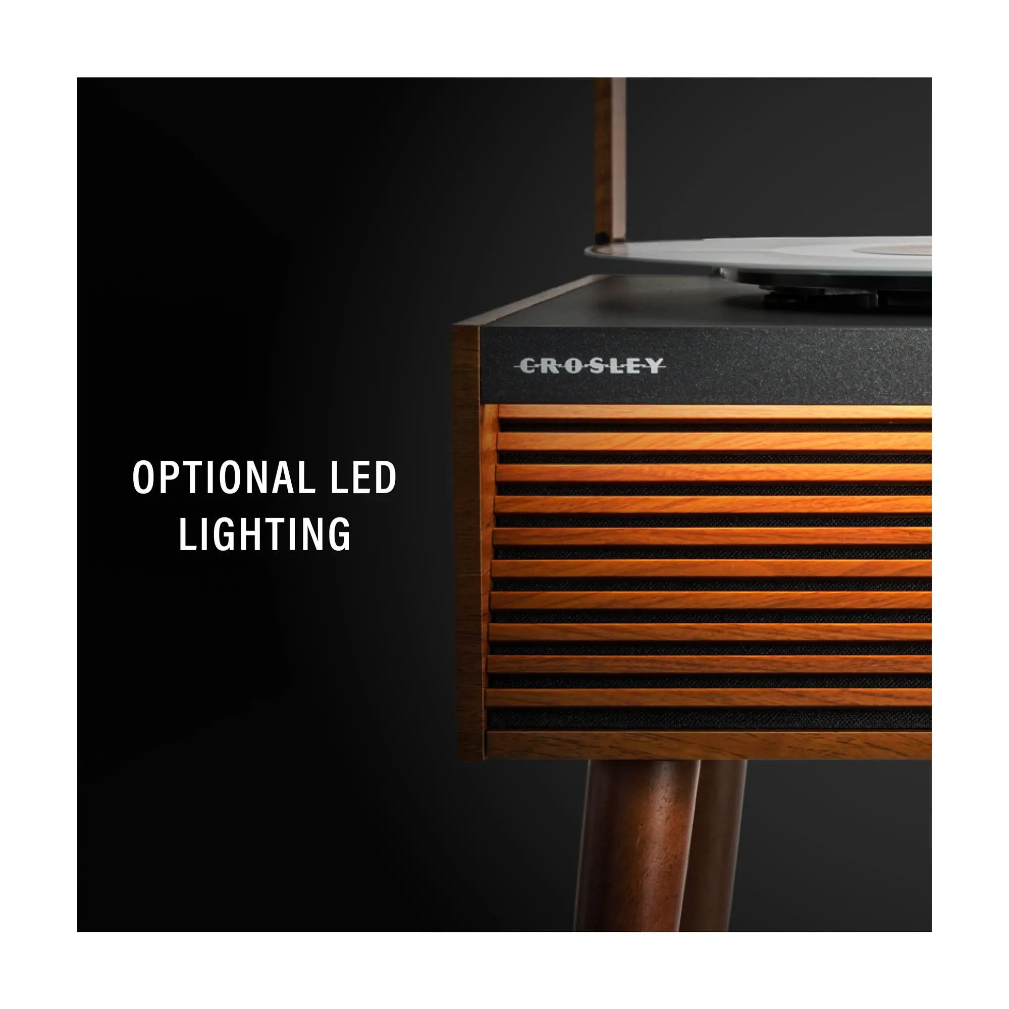 Imagine spinning your favorite vinyl while adding a cool vintage vibe to your space. The Crosley Dean Record Player nails that mid-century charm with its slatted front design and optional LED lighting. Whether you want a classic look with the removable tapered legs or a sleek compact setup using the silicone feet, this turntable adapts to your style. It plays all your beloved records at 33 1/3, 45, and 78 RPM speeds, delivering rich sound through built-in full-range stereo speakers. Plus, with Bluetooth 5.4 wireless connectivity, you can effortlessly stream digital tunes or connect external speakers (not included). The player also features an aux input and RCA output for versatile audio options, plus a handy auto stop and cueing lever for smooth operation. Included in the box are the turntable, 45 RPM adapter, power adaptor, four legs, dust cover, and silicone feet. Ready to bring classic vibes and modern convenience to your music setup? The Crosley Dean is here to spin your soundtrack in style.