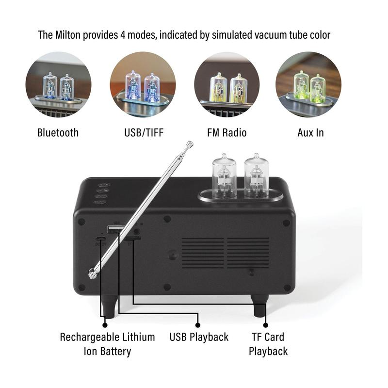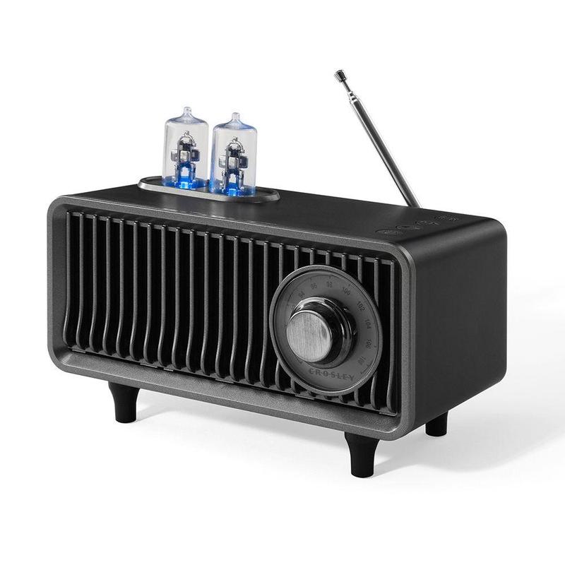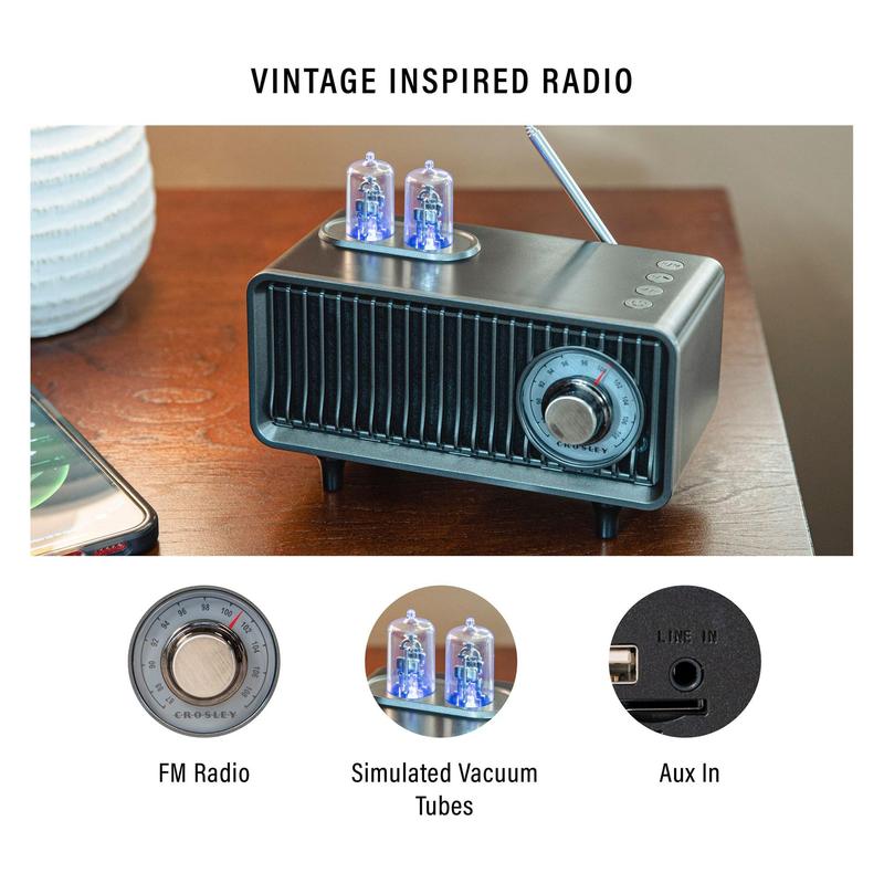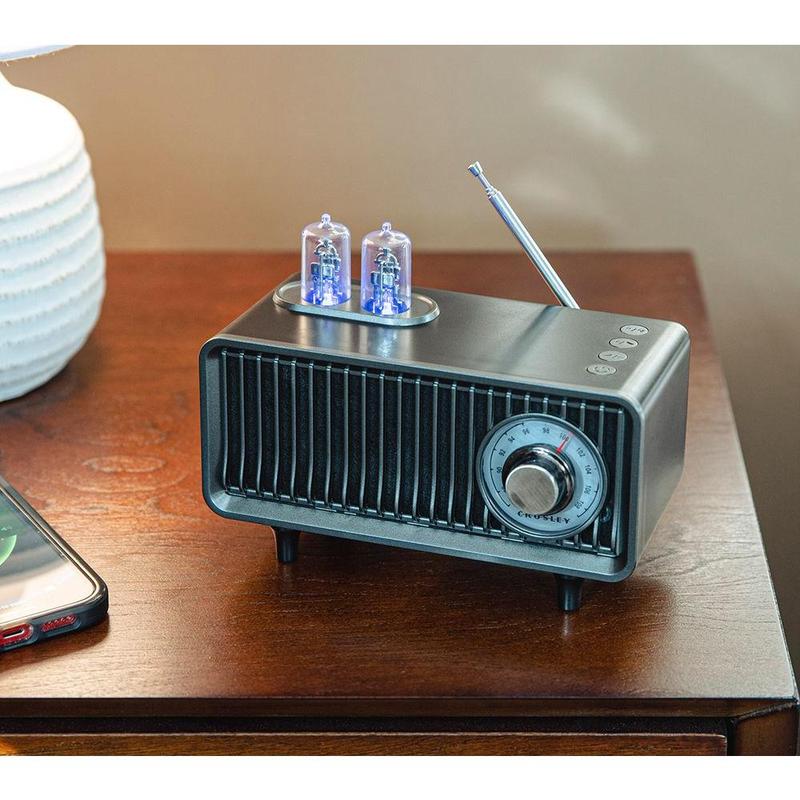 Step back in time with the Crosley Milton, a radio that combines vintage-style charm with modern functionality. Its simulated vacuum tubes glow in different colors to indicate the mode, adding a nostalgic touch while you enjoy FM radio, USB playback, or stream your favorite tunes via Bluetooth wireless technology. From Crosley.