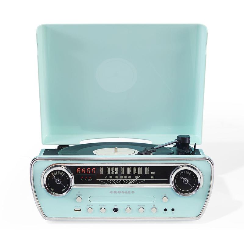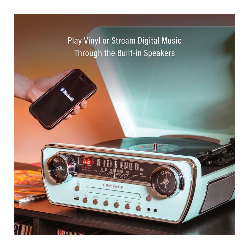 Looking to add a splash of retro cool to your music setup? The Crosley Powel 7-in-1 Record Player is your all-in-one entertainment hub with a vintage car dashboard vibe. Whether you’re spinning your favorite vinyl, popping in a CD, or tuning into AM/FM radio, this player has you covered. With a 3-speed turntable supporting 33 1/3, 45, and 78 RPM records, plus a handy 45 RPM adapter, it’s perfect for every vinyl lover. Bluetooth 5.3 wireless tech lets you stream playlists from your phone, while built-in full-range stereo speakers fill your room with rich sound. Need more? Plug in your headphones or connect external speakers via RCA output. The belt-drive DC motor ensures smooth, consistent playback, and the turntable auto-stop protects your records. Included are the 7-in-1 record player, 45 RPM adapter, and power adapter. Sized just right at about 14.25"D x 14.75"W x 5.75"H, it fits great on your desk or shelf. Ready to spin some tunes with style? Grab the Crosley Powel and bring retro vibes and modern convenience to your music moments!