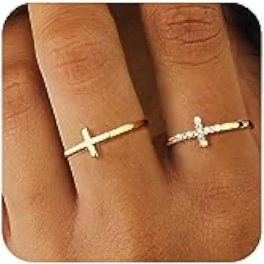 2 gold rings set with one classic smooth cross non tarnish gold ring and one sparkling cz cross ring.You can stack them with other rings or wear them yourself to create a relaxed look.