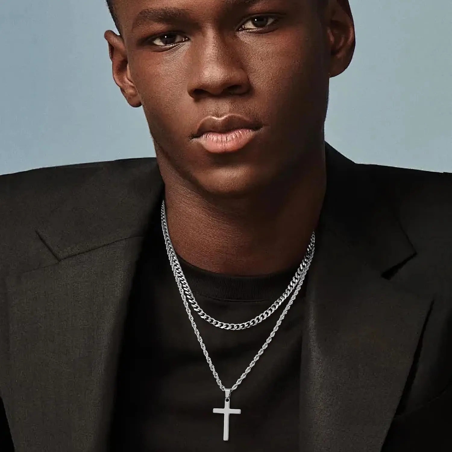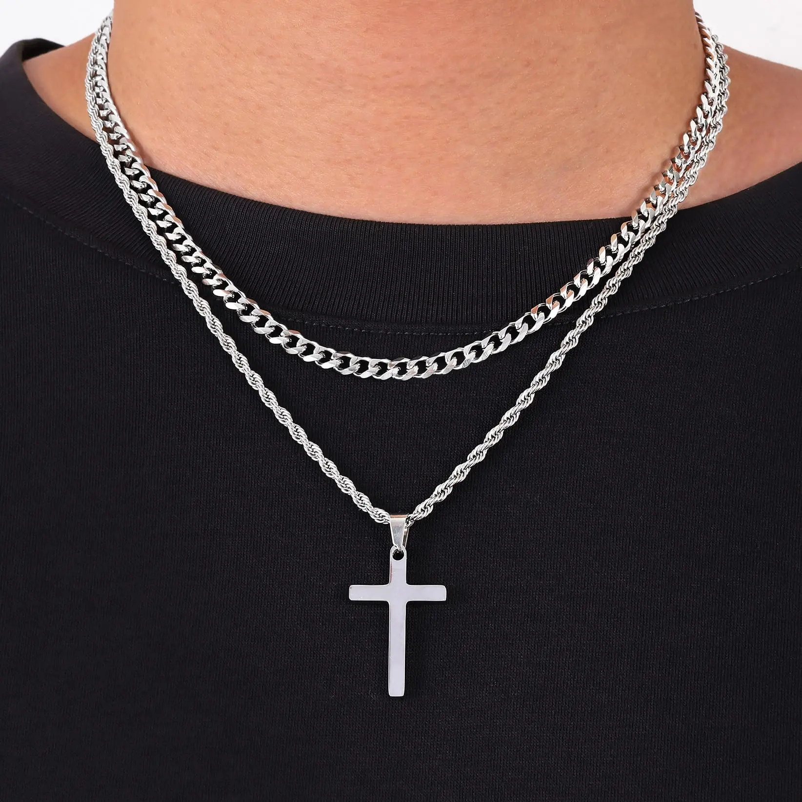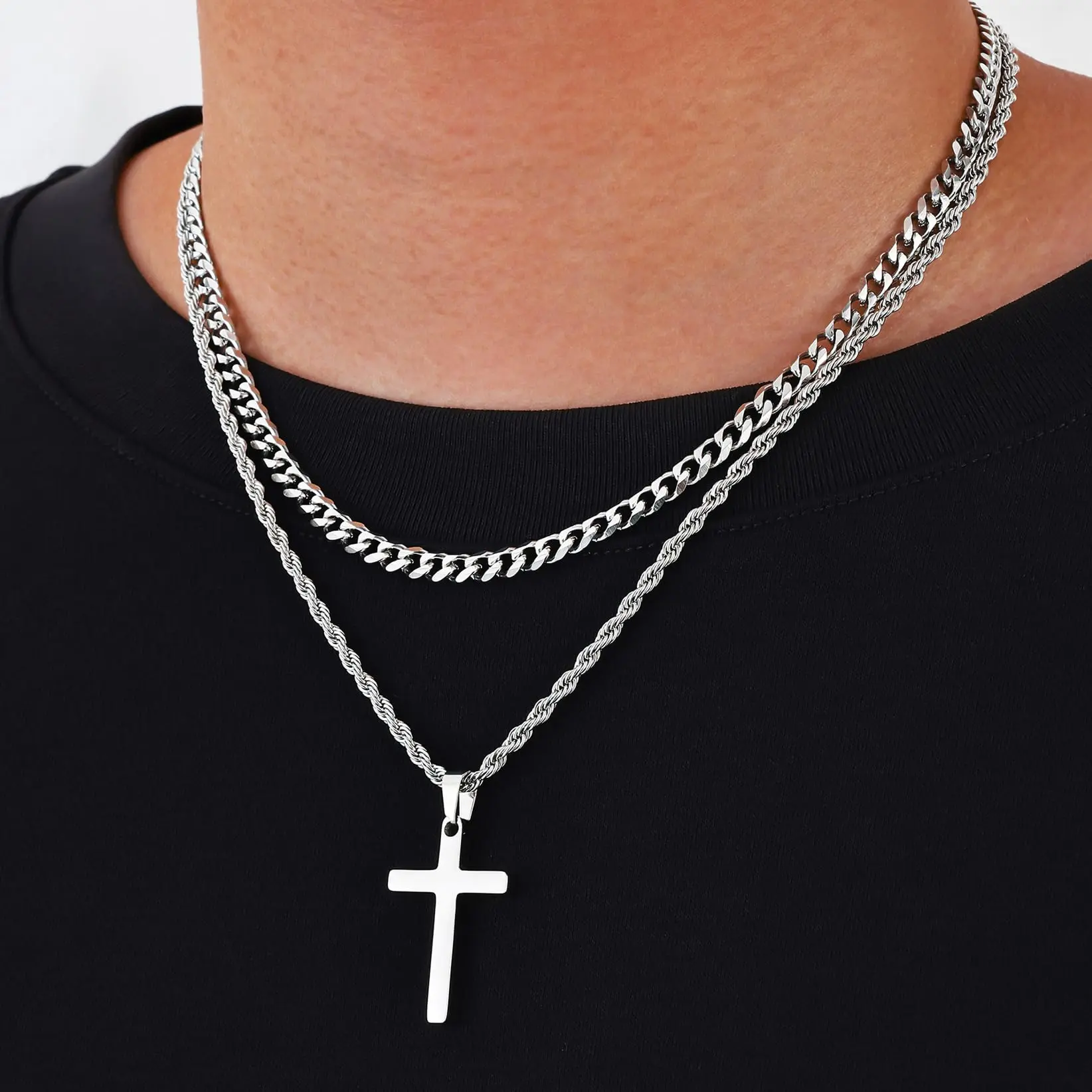 Cross Necklace for Men, Layered Mens Cross Necklaces Stainless Steel Cross Pendant Cuban Link Rope Chain