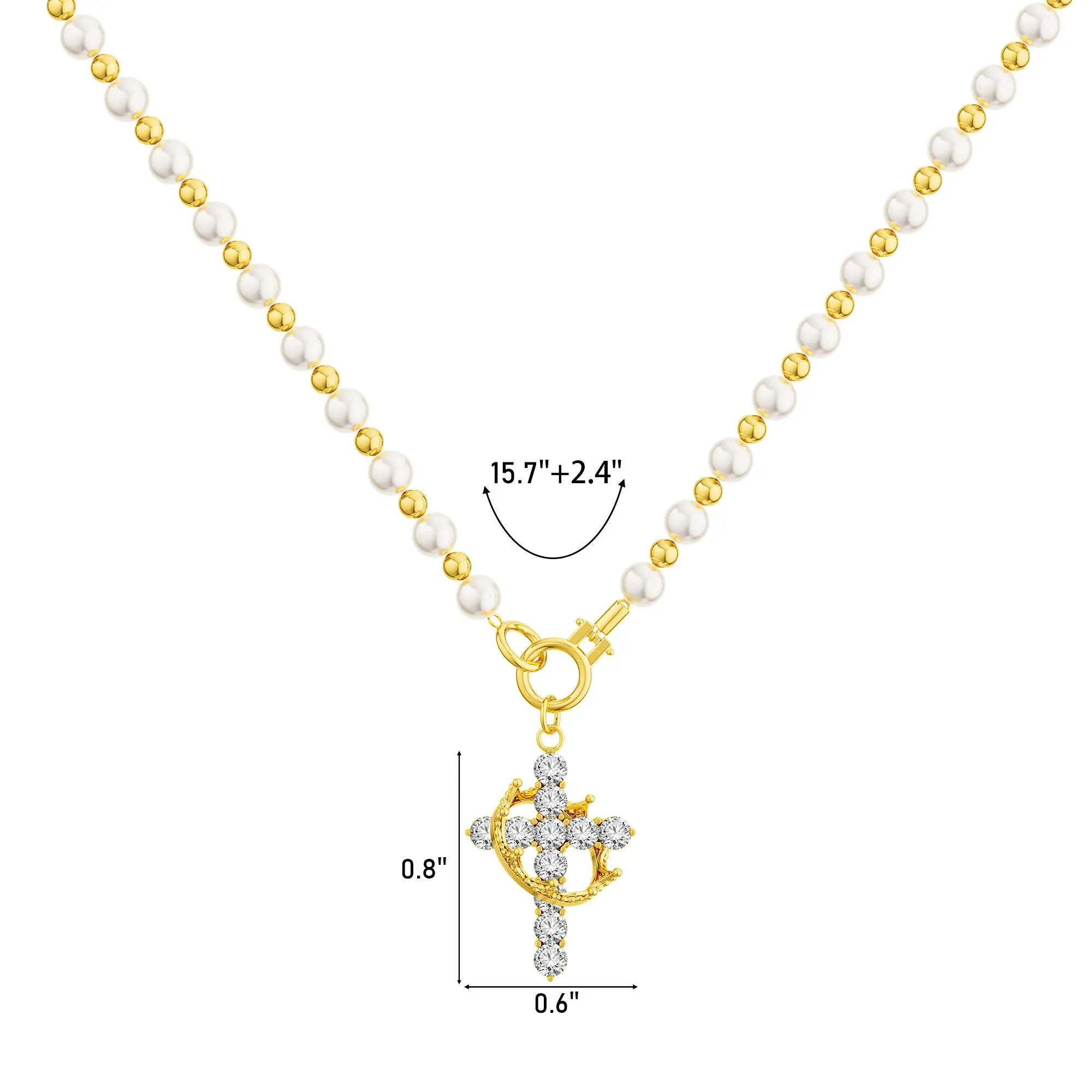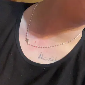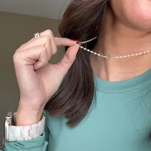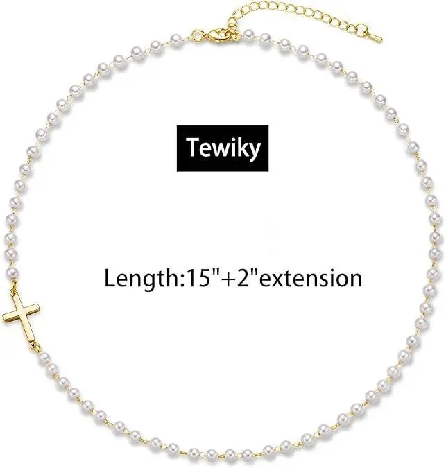 This is a great dainty cross and pearl necklace. It’s 15in long but has a 2inch extender if you don’t want to wear it as a checker. Great for layering.