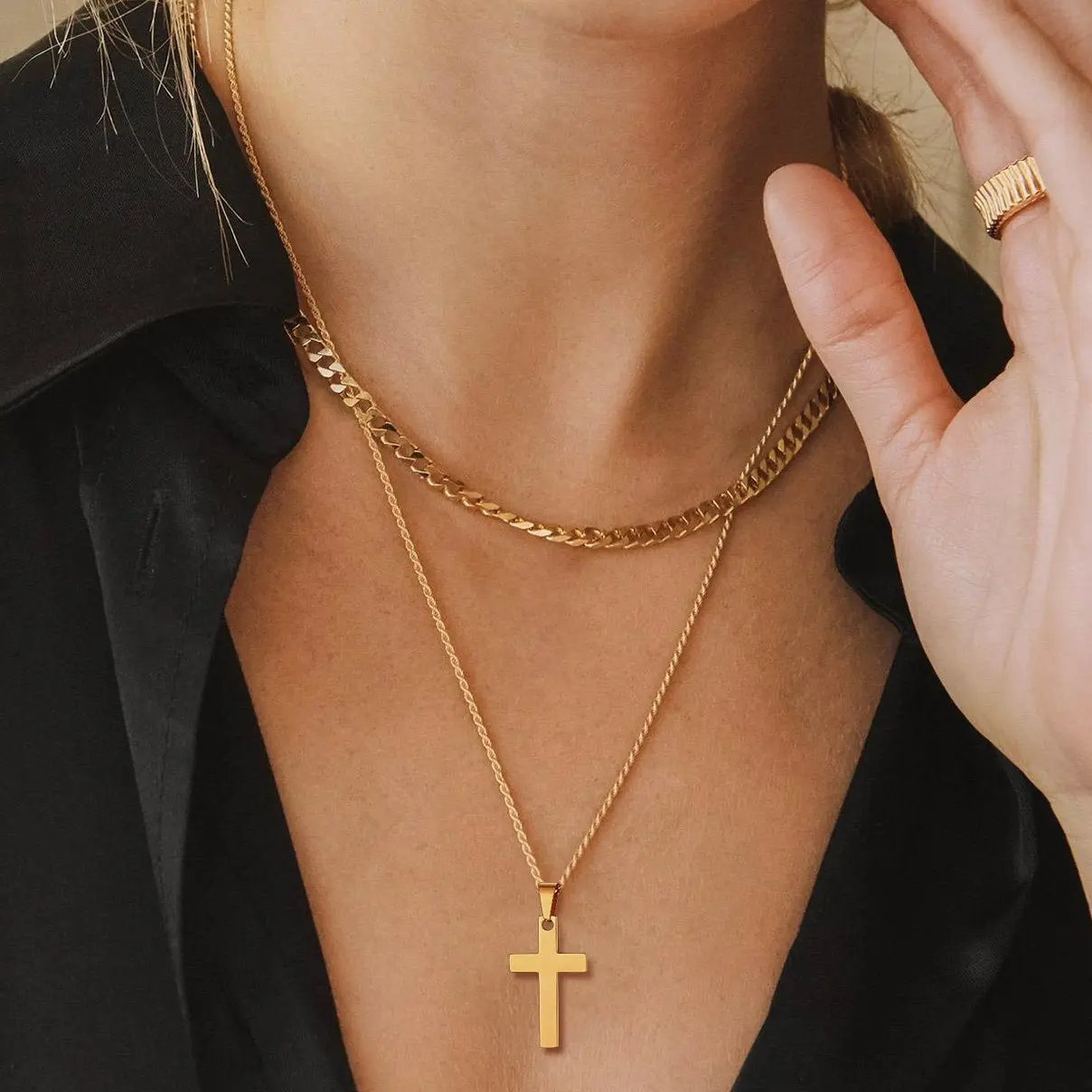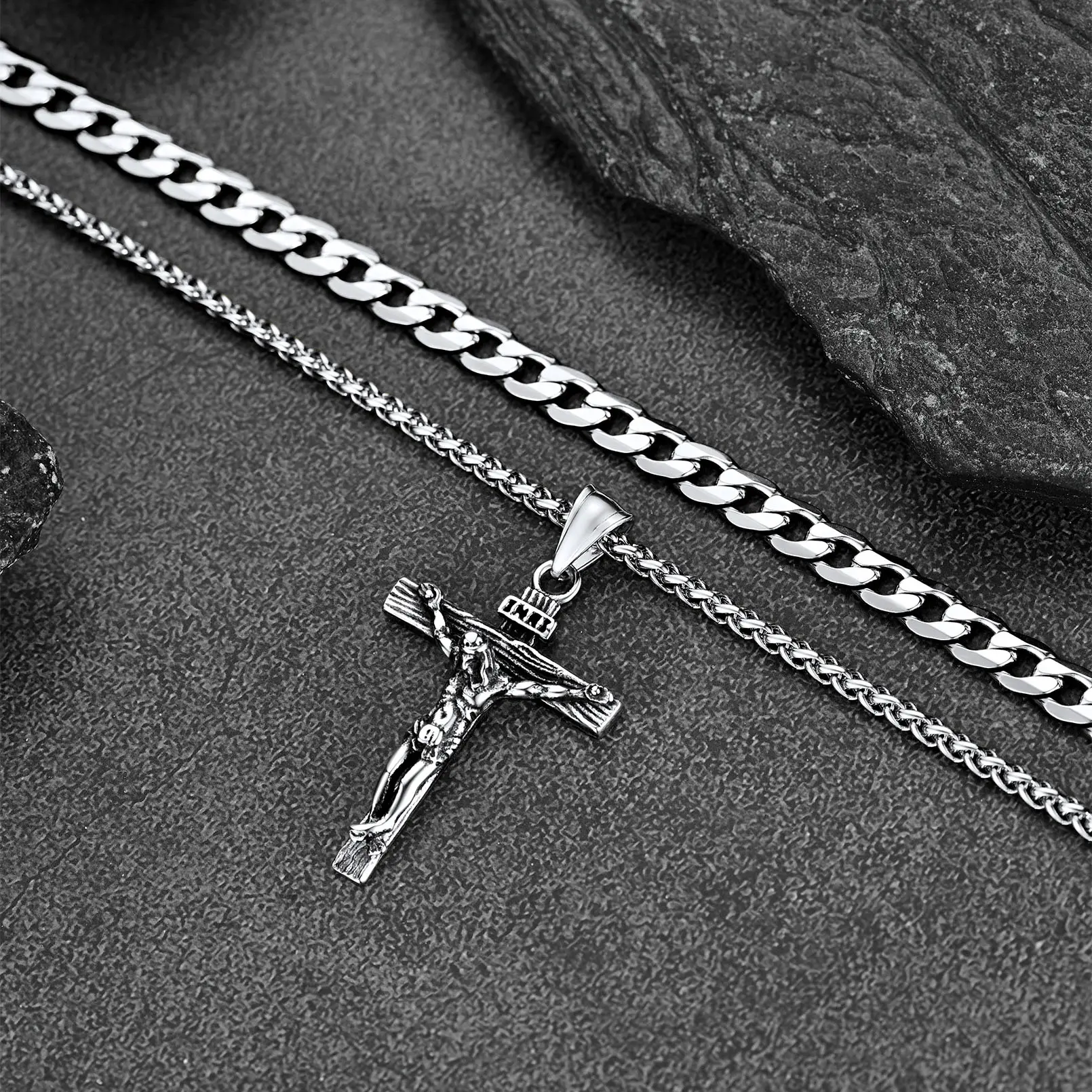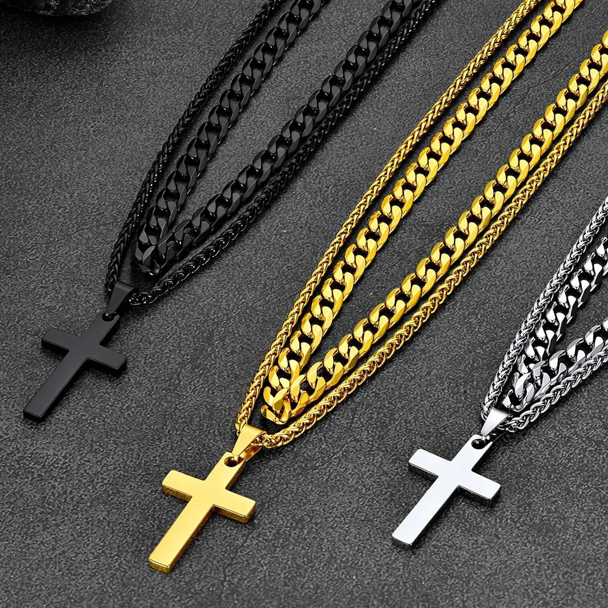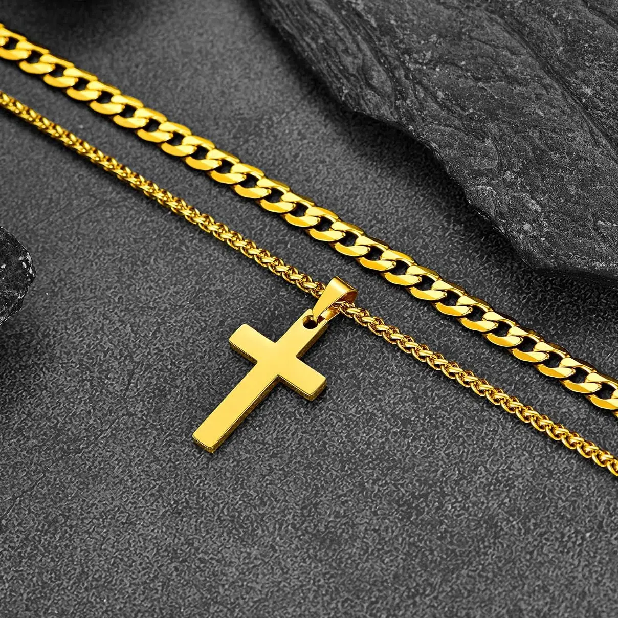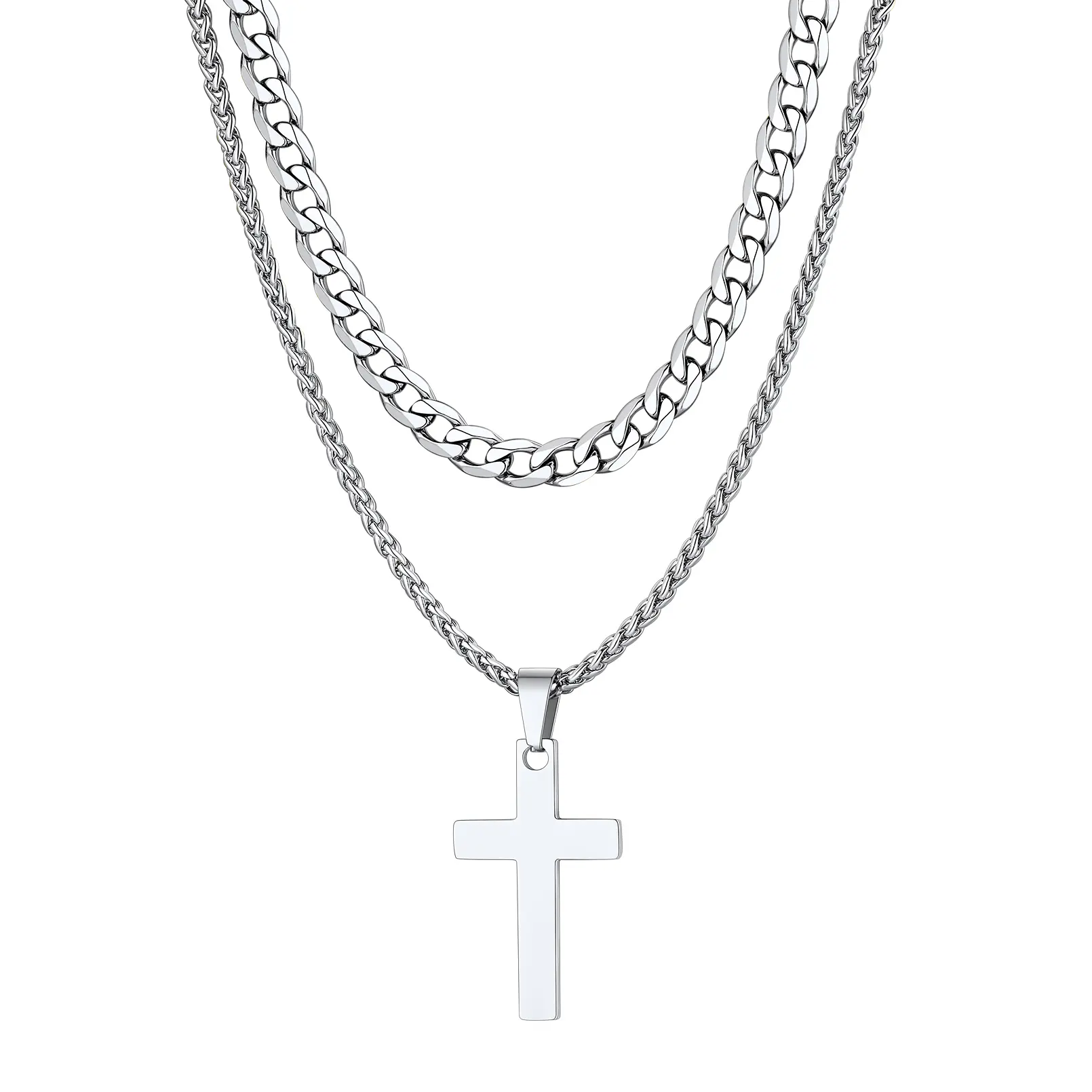 This double-layered cross pendant necklace set features an 18" Cuban chain and a 20" wheat chain with a sleek cross pendant. Made from high-quality, tarnish-resistant stainless steel, it's durable and safe for sensitive skin. The versatile design allows you to wear each piece separately or layered, making it perfect for any occasion, from casual outings to formal events.