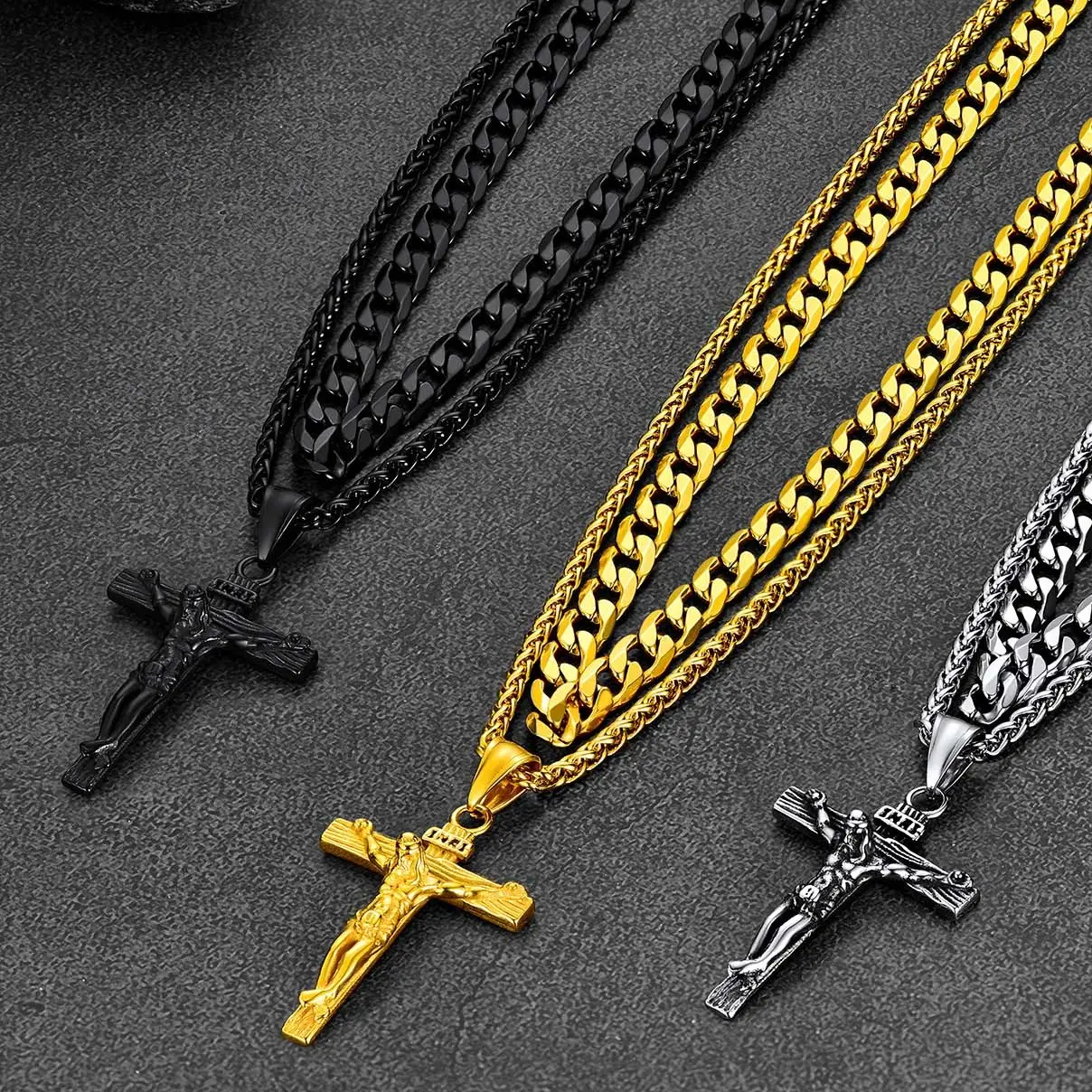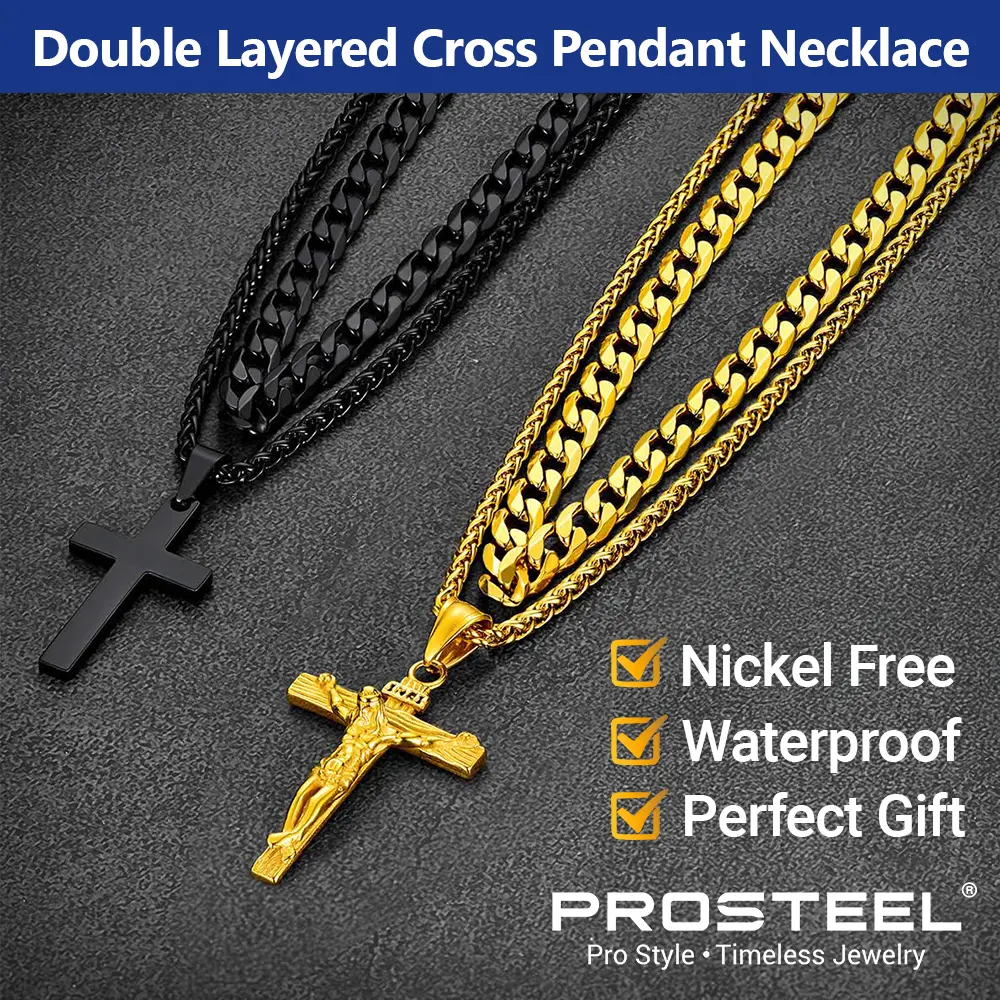PROSTEEL Double Layered Cross Pendant Necklace Set Stainless Steel Catholic Crucifix Cuban Chain Necklace Religious Jewelry For Men Women Gift Box
