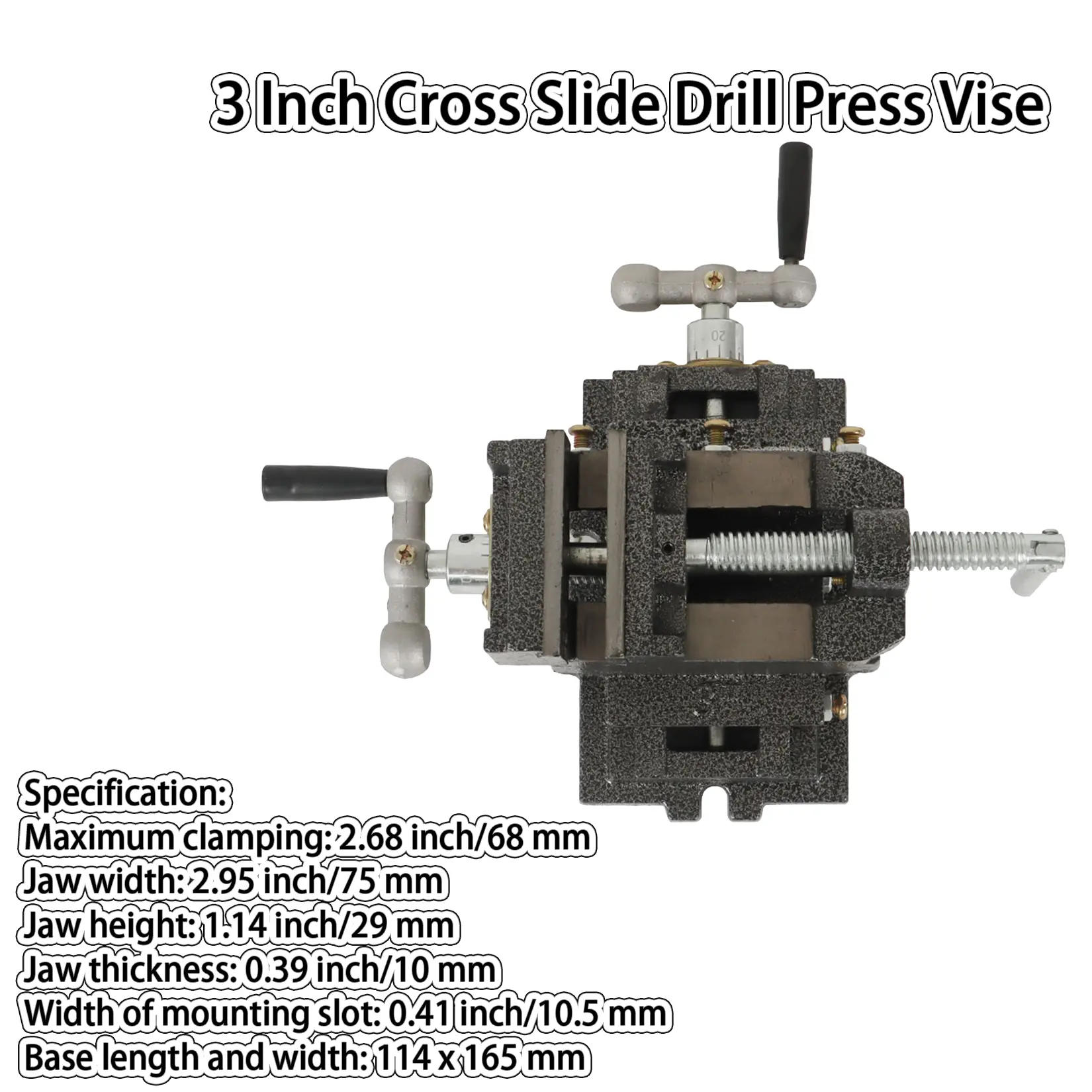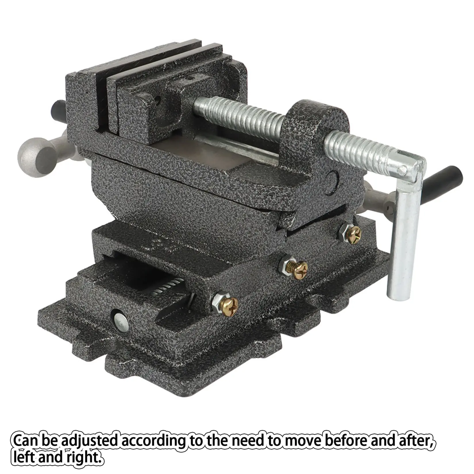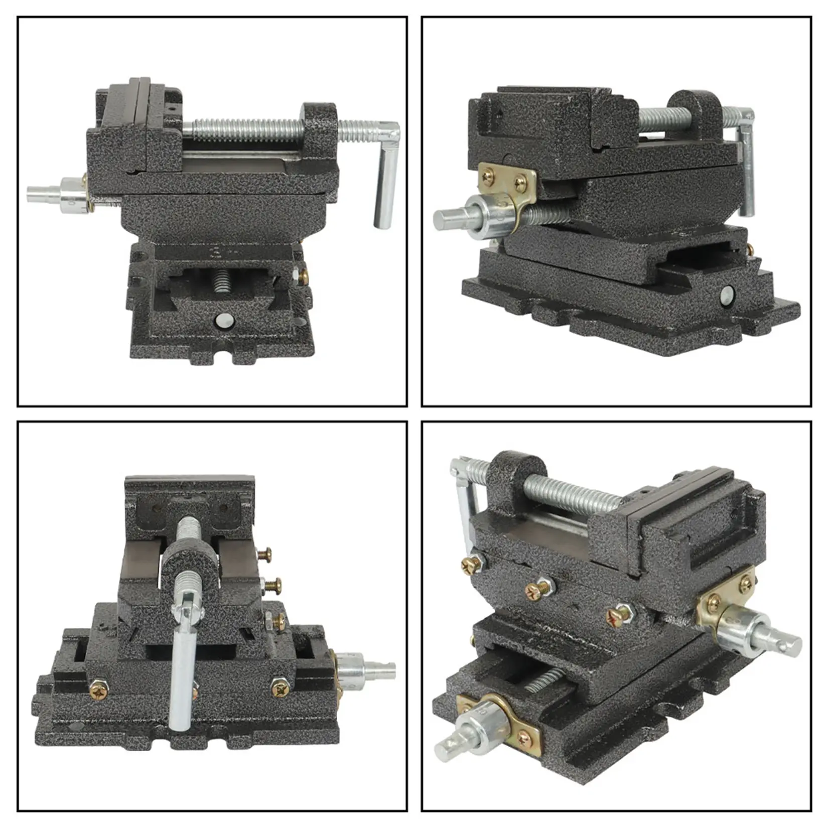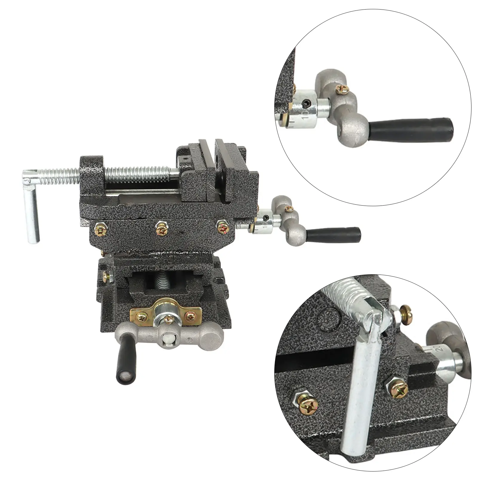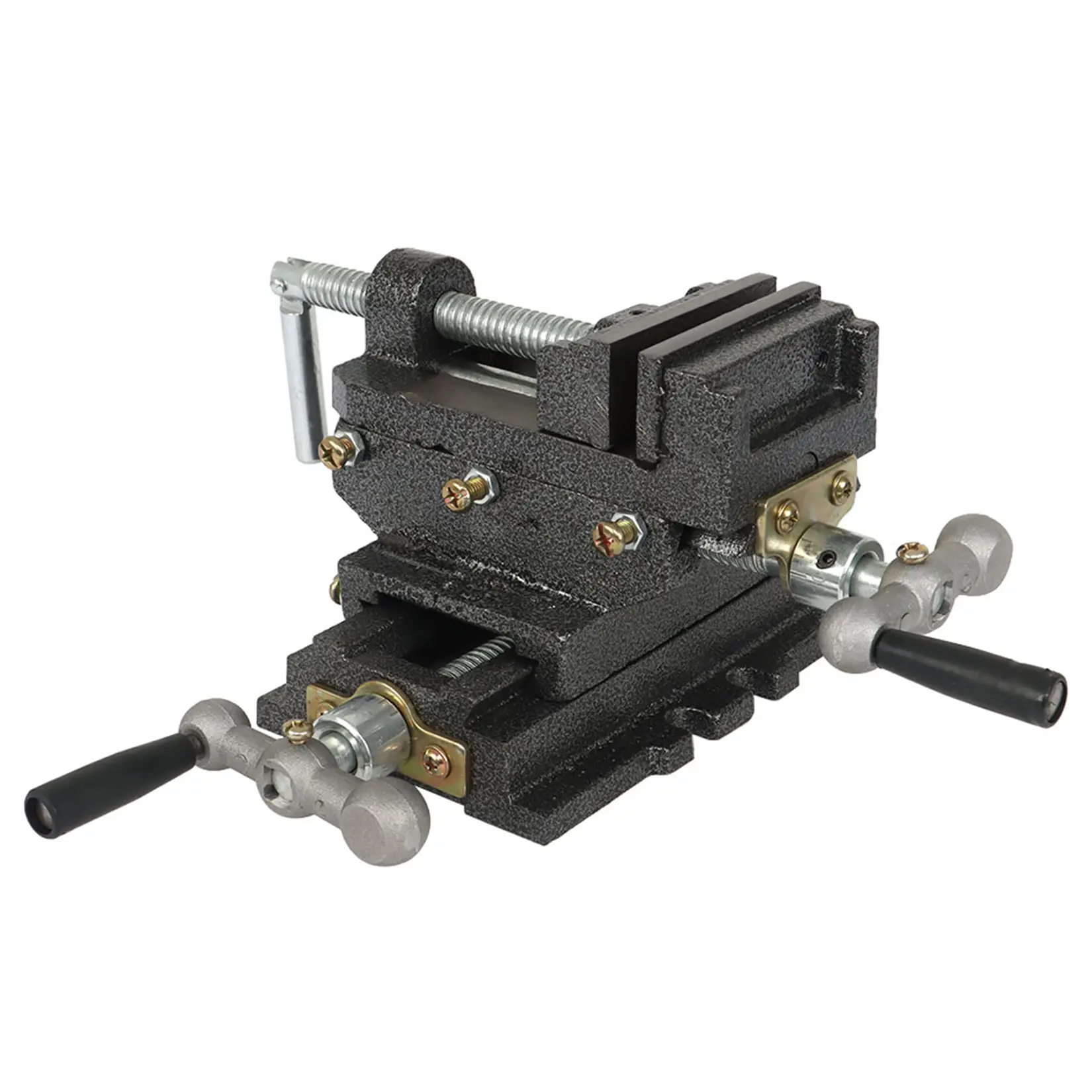 Durable cast iron construction. Powerful serrated steel jaws. Cold rolled steel screws. 2 swivel crank handles for adjusting vise front to back and left to right. Bolt down slots for securing. Hinged vise crank handles drops out of the way. Designed for woodworking and metalworking. Can also be attached to a lathe or other tools as needed to hold work pieces in the exact location needed. Easily machine wood and metal parts with high precision.