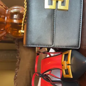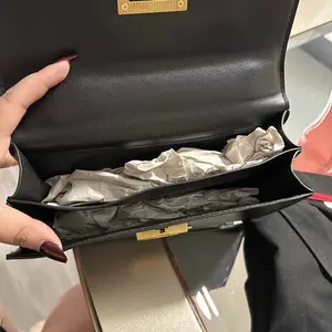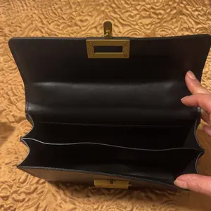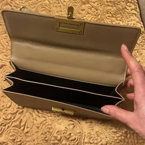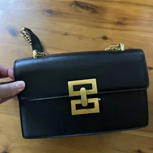 Arrived well packaged with multiple items. This bag is beautiful and I love it! It's so sleek and soft with the gold trim of the clasp and shoulder⛓️. It's divided into 2 compartments and is roomy for a small bag. This exceeded my expectations and I'm very happy with my purchase. I highly recommend this bag.