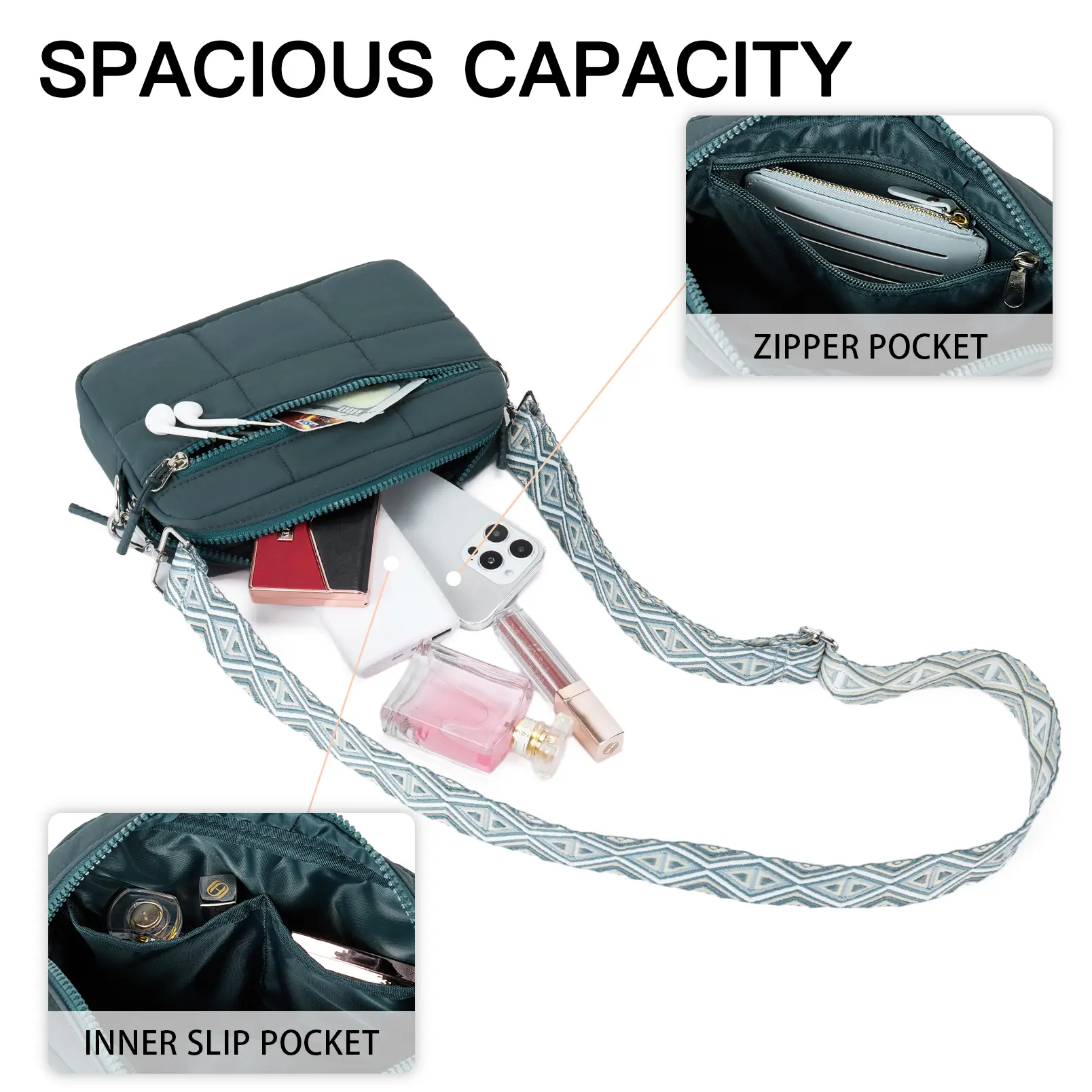 The interior features a secure zipper pocket, an inner slip pocket for cards or small items, and a convenient back zipper pocket for items you need quick access to, such as your phone.