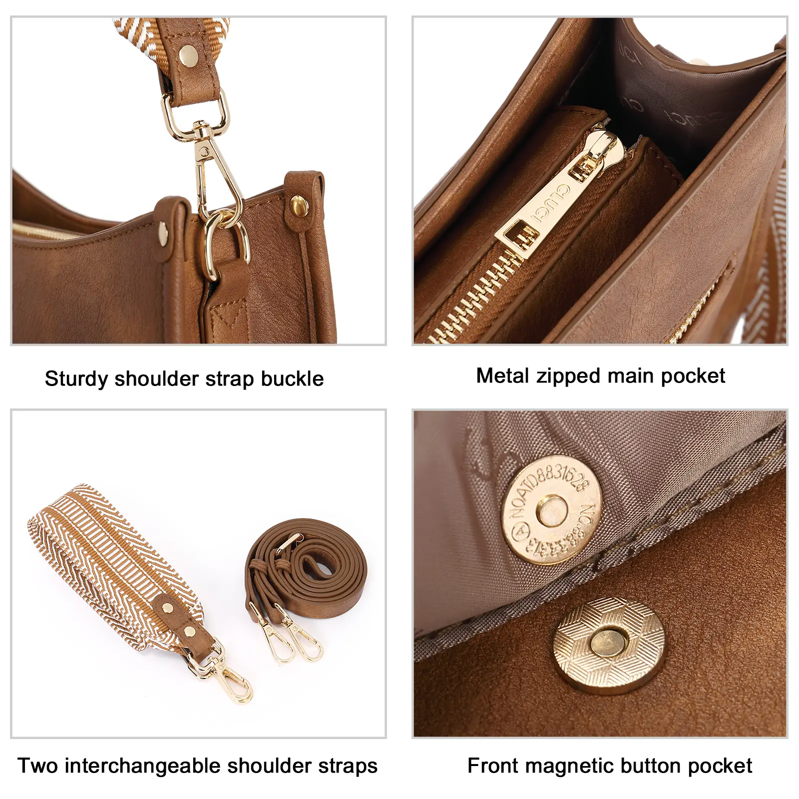 Designed with 1 main pocket, 1 inner zipper pocket, 1 slip pocket, 1 front magnetic pocket, and 1 back zipper pocket, this bag helps keep your essentials organized and easy to reach.