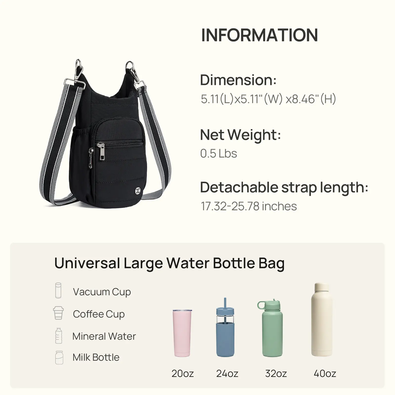 Great for travel and kids events. Fits 40oz water bottle woth handle plus keys and phone