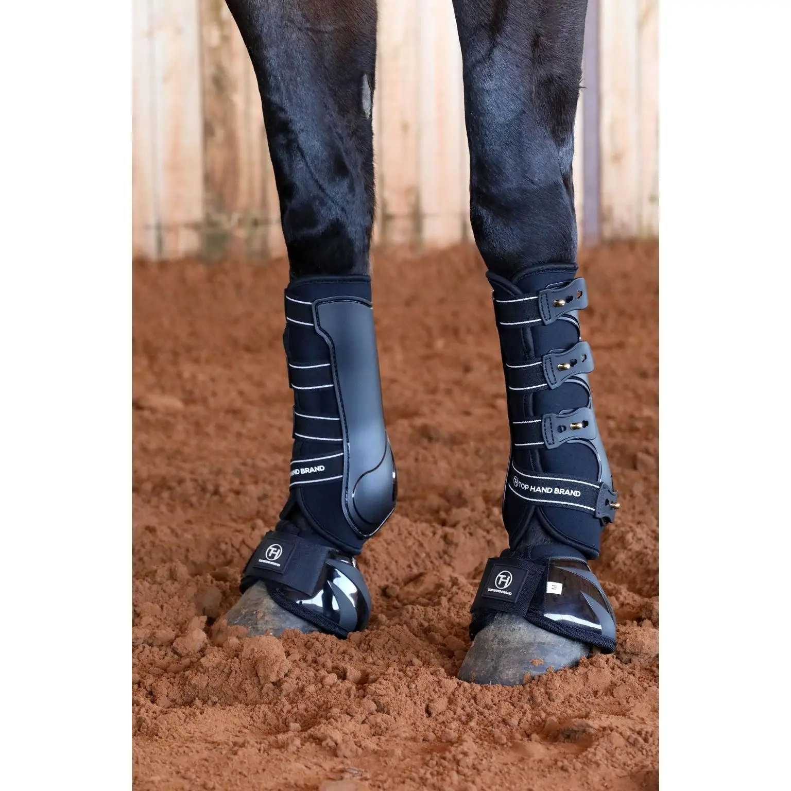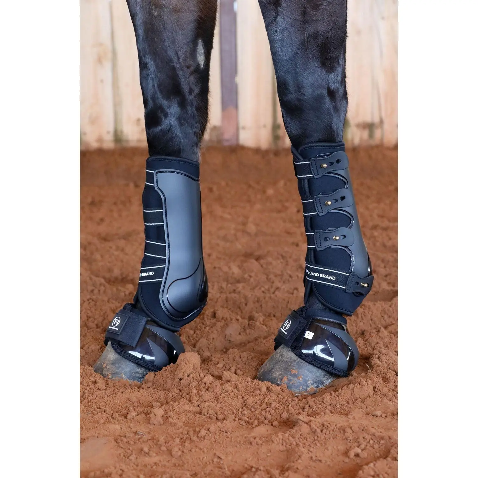 This boot is a hybrid open and closed front. Traditional open front jump boots are designed so the horse feels the strike, or the pole when going over jumps. In our western industry, I did not want our horses to feel a strike on the front of their cannon bone. So, We have a closed front technology, with the full cannon bone and ankle support with coverage of a closed front boot.