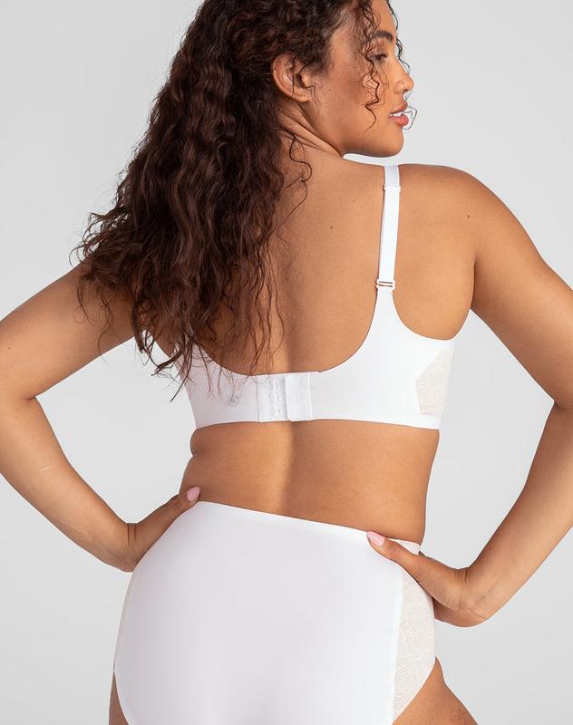 Honeylove's CrossOver Lace Bra features signature flat lace details. It includes a bonded cradle to replace underwire, ensuring comfort. The smoothing wing combat back and underarm bulging, while foam cups enhance your shape.