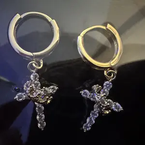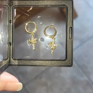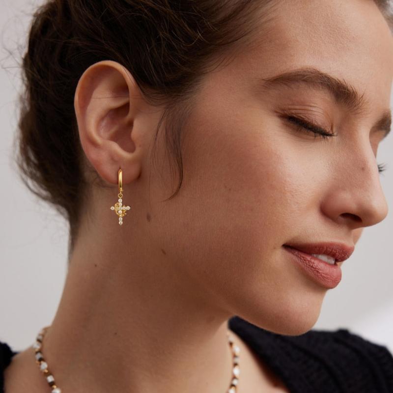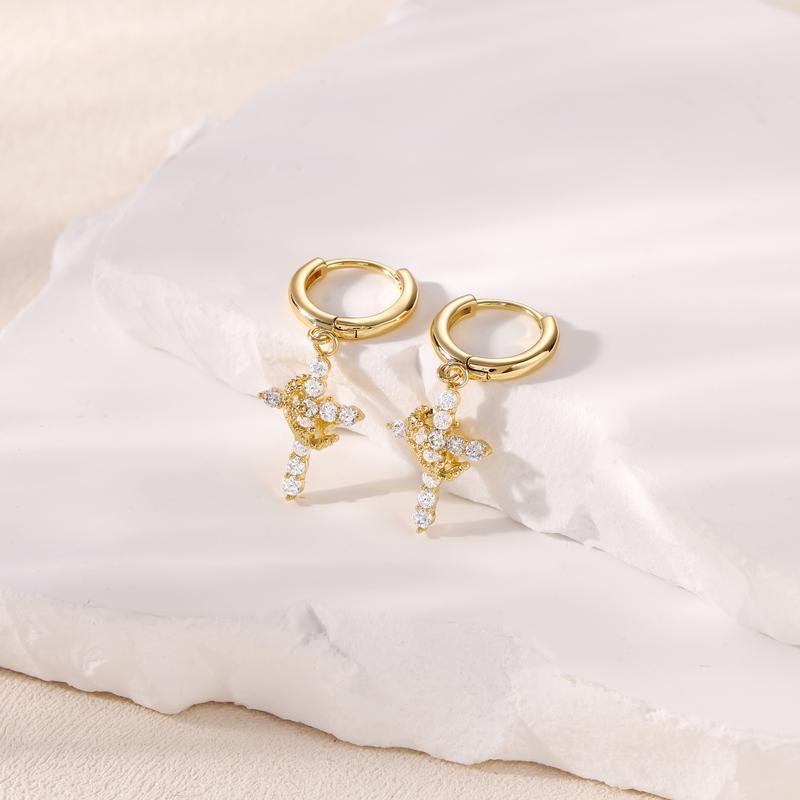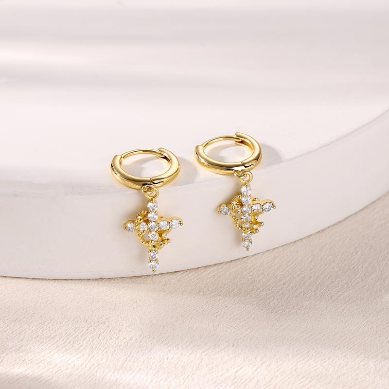 Dainty CZ Cross Pendant: These earrings showcase a delicate cross pendant, ideal for everyday wear. The clear cubic zirconia adds a subtle sparkle. Perfect for women who value understated elegance. Enhance your look with this charming accessory.