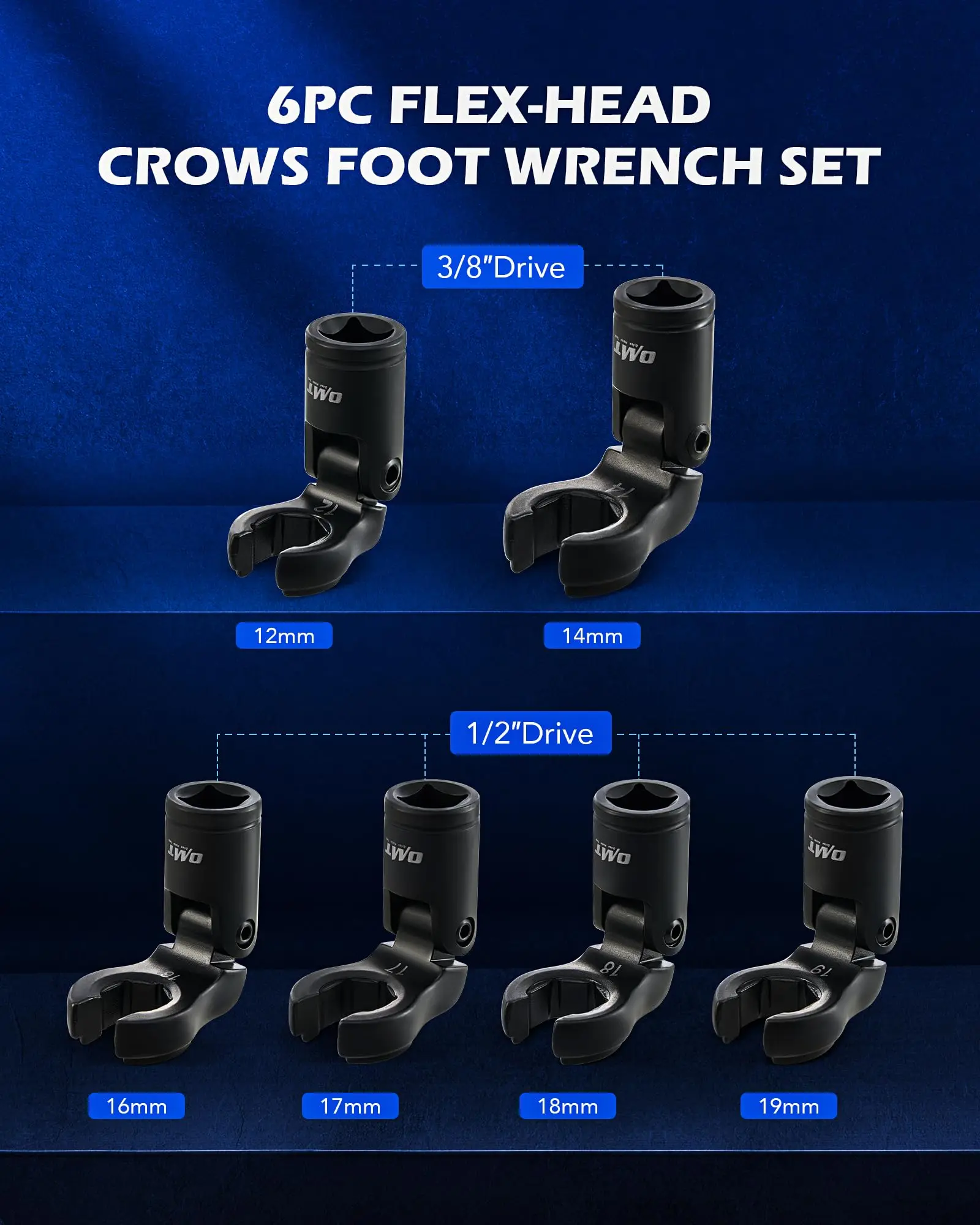 This metric crowfoot wrench set includes the six most commonly used sizes: 12 mm, 14 mm, 16 mm, 17 mm, 18 mm, and 19 mm. They work seamlessly with your 1/2" & 3/8" drive ratchets, torque wrenches, and more.