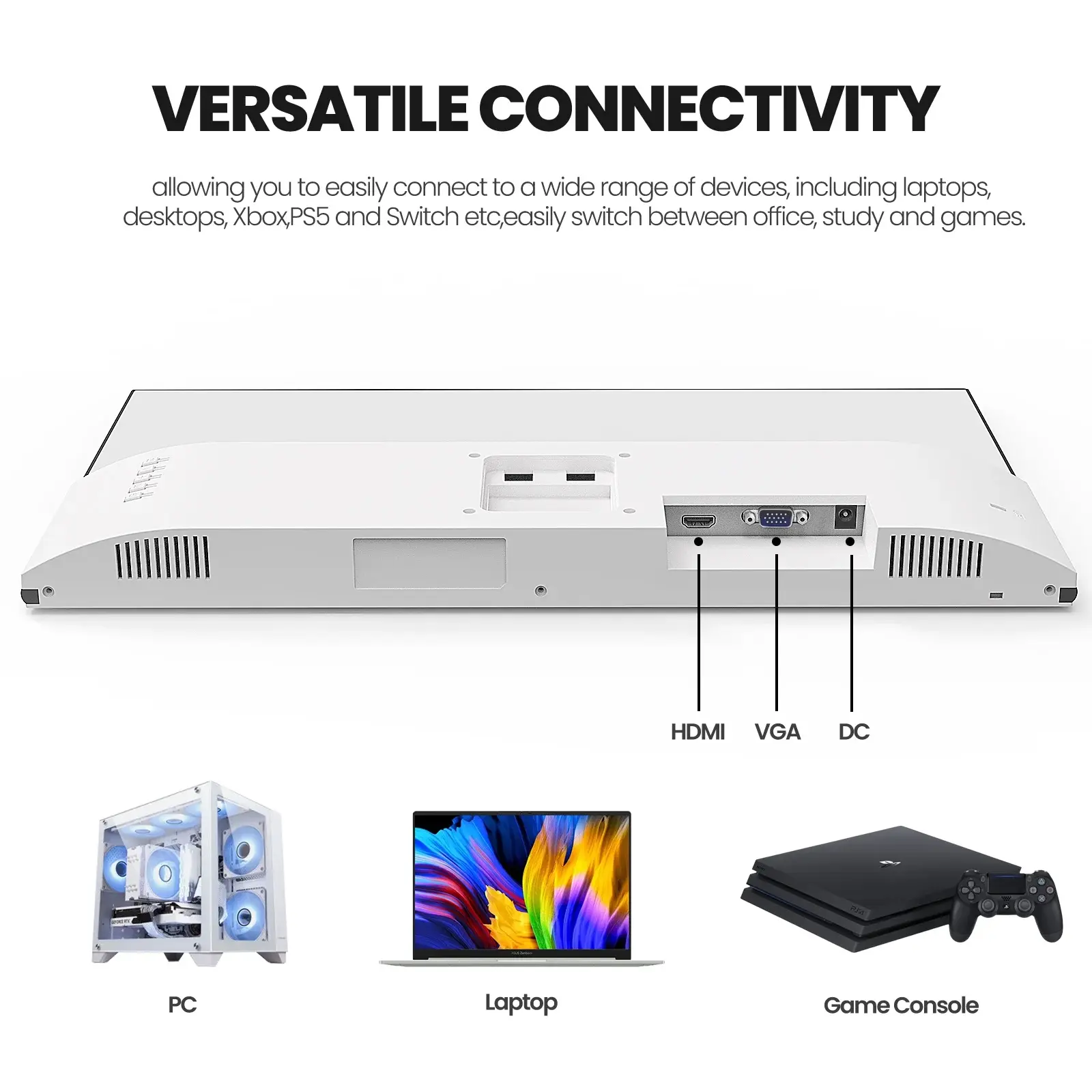 ·Versatile Connectivity: Dual ports (HDMI 1.4 and VGA) support various devices including PCs, laptops, and gaming consoles.