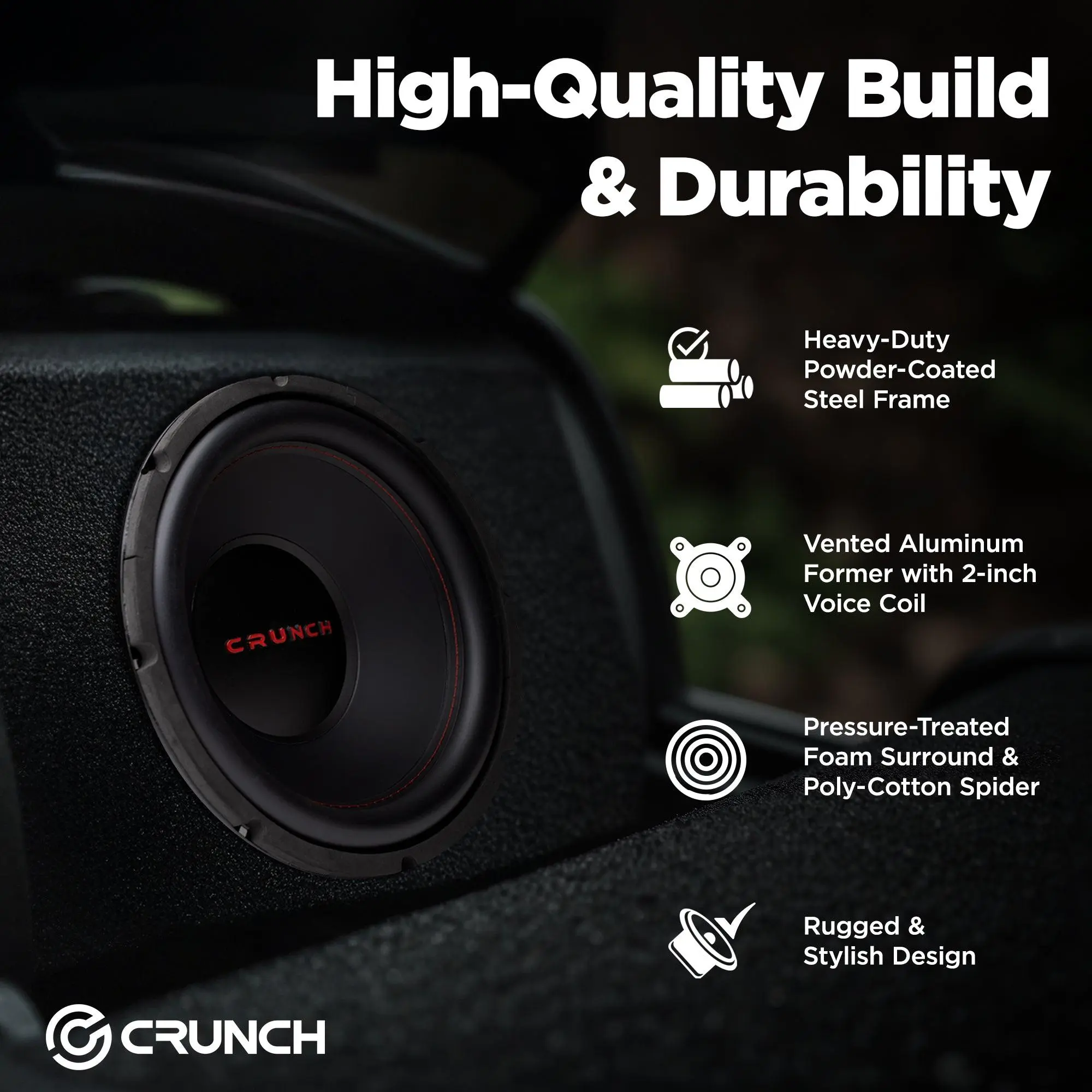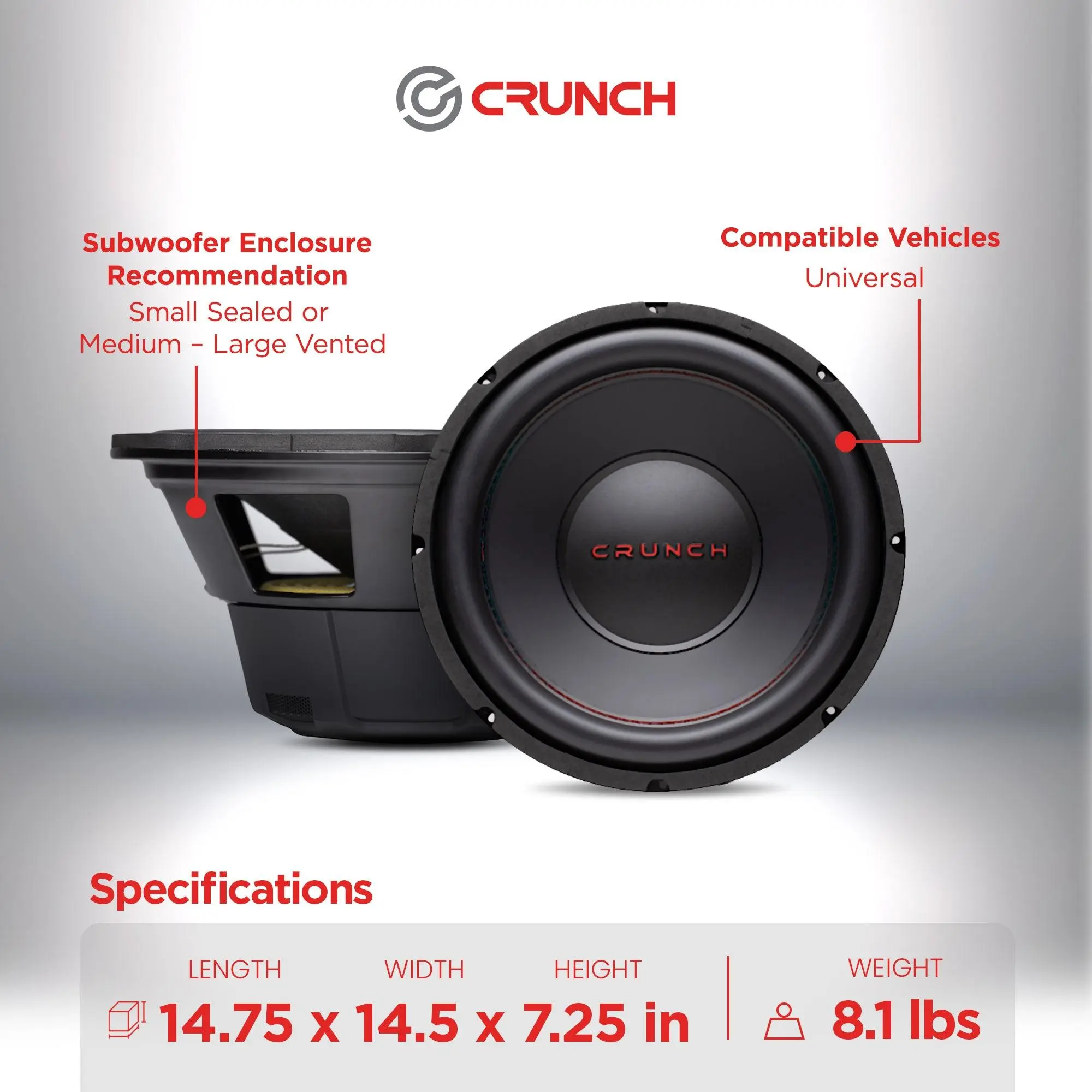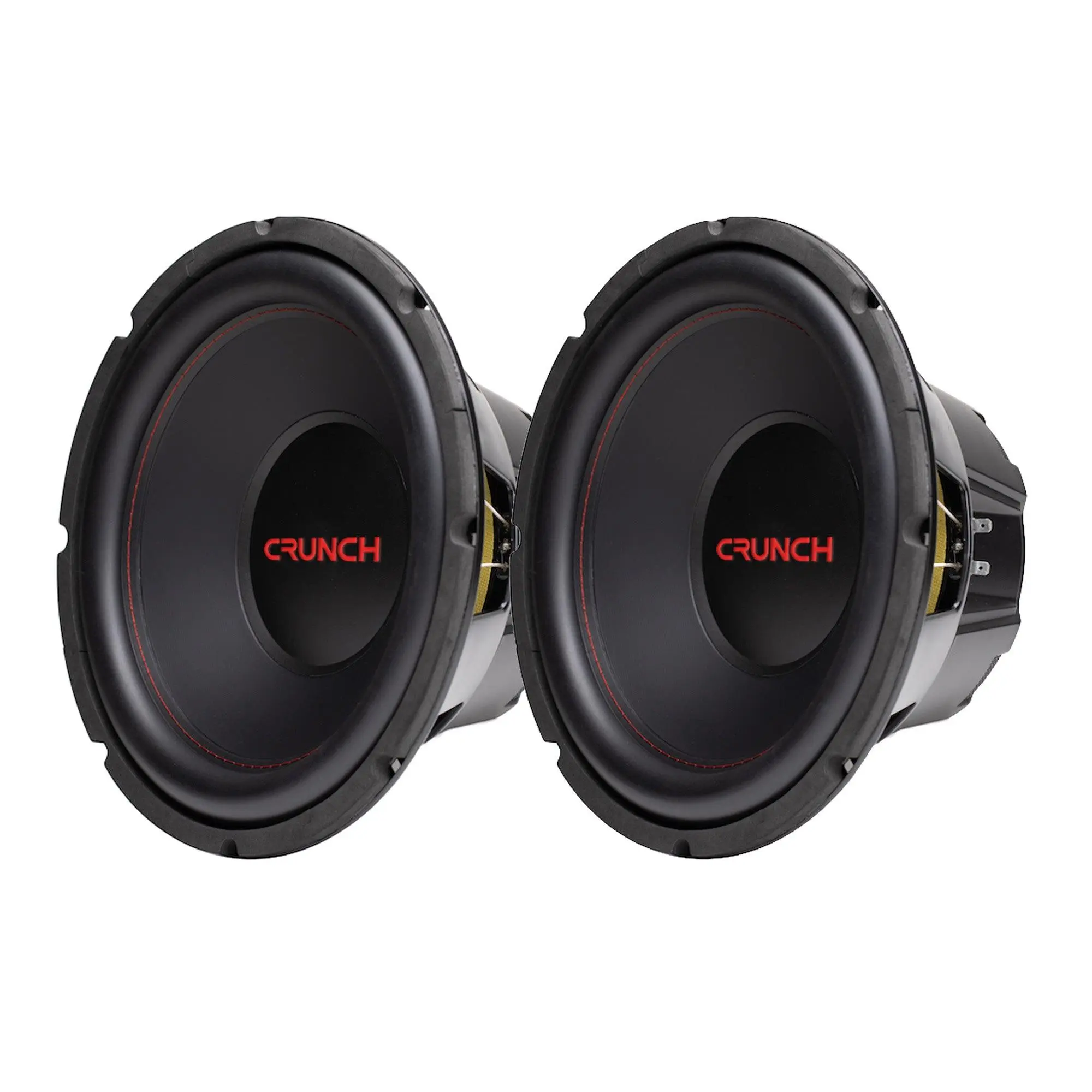 Optimize your sound on every road trip or errand run with the 2-pack of Crunch 12-Inch 800-Watt Subwoofer Speakers. These car speakers are designed with durability and efficiency in mind to deliver quality, powered-up sound you'll love.This set of 12-inch cart stereo speakers pumps out 800 watts of MAX power and 400 watts of RMS power with a 4-ohm impedance, creating powerful sound to accompany you on your car adventures. The vented aluminum former holds a 2-inch voice coil and allows heat to be exchanged resulting in less heat distortion. Designed with a heavy-duty, powder-coated steel frame, these subs allow back venting for increased power handling and reliability. Spade-style terminals allow for easy installation and this automotive speaker set is versatile enough to be installed in a small or medium sealed enclosure or large vented enclosure. These sub speakers measure 12.25 inches in diameter with a 10.94-inch cutout and 5.61-inch mounting depth.Enjoy your music on every ride with the 2-pack of Crunch CRW12D4 12-Inch 800-Watt Subwoofer Speakers.
