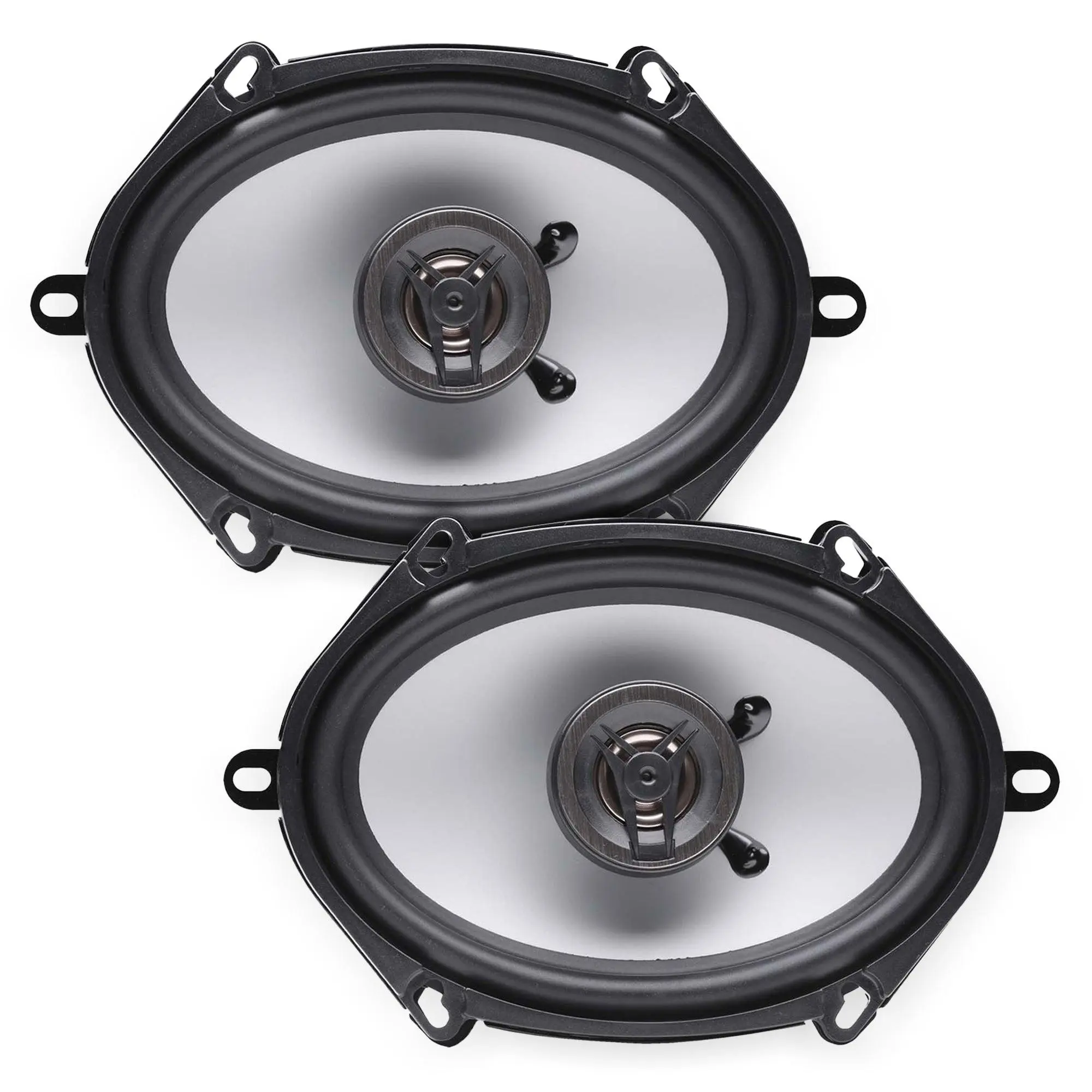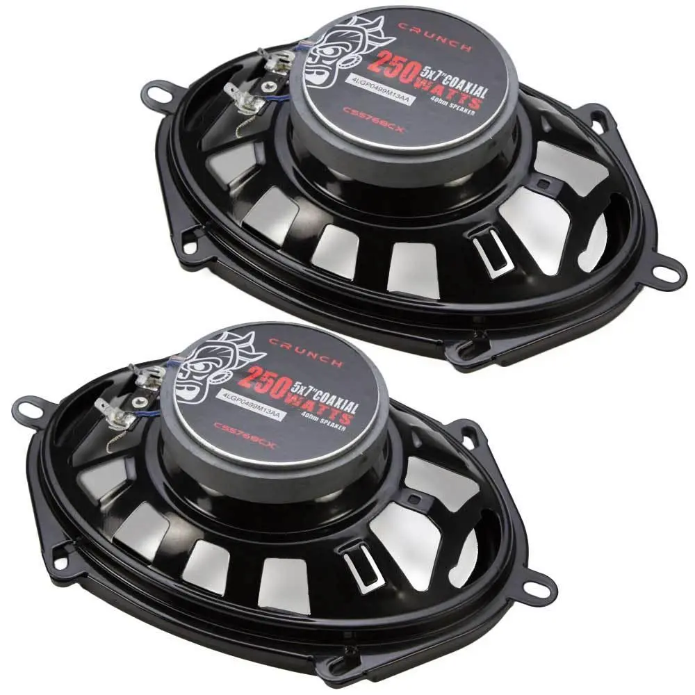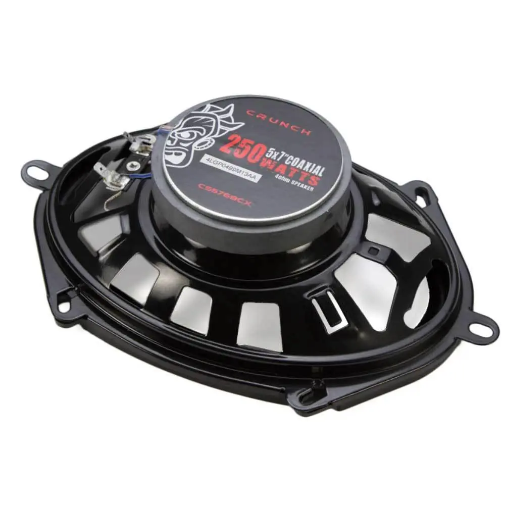 Expertly crafted with hand selected materials, these Crunch 250 watt full range 2 way coaxial speakers are made to blow you and your factory speakers away.These 6x8 5x7 speakers have 125 watts of RMS power handling and 250 watts of peak power handling. The anti resonant stamped steel basket frame provides minimal harmonics or distortions from flex or ringing, while the 1 inch tweeter provides clear highs and handles plenty of power.It's constructed with high quality materials including a textured ABS gasket, braided tinsel leads, pure copper voice coil, epoxy infused natural fiber spider, and a Ferrite magnet motor.