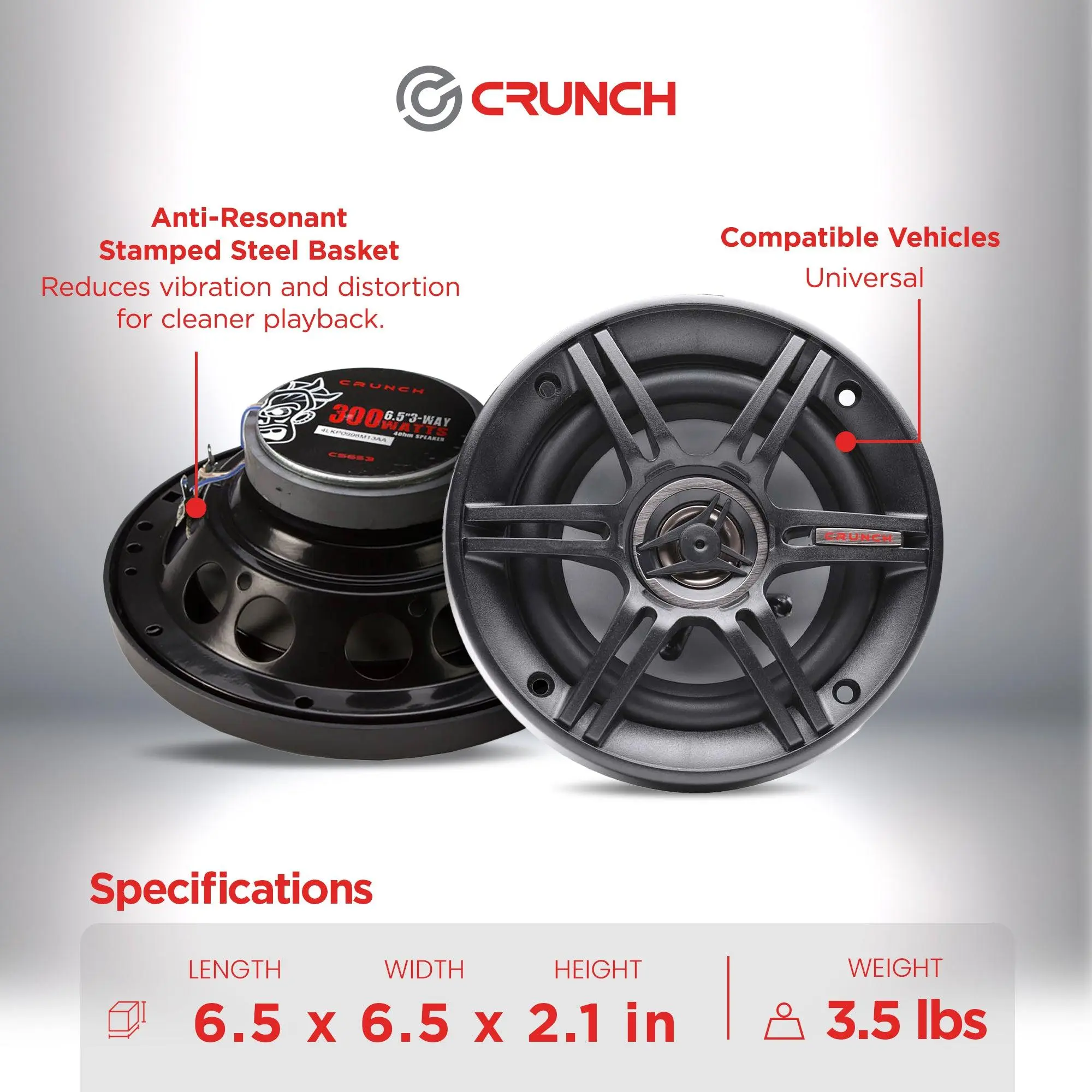 Get the sound you crave with the Crunch CS653 6.5-Inch 3-Way Full Range Car Speakers, engineered to deliver high-quality audio performance and long-lasting reliability. Designed for music enthusiasts who demand clarity and punch, these speakers handle up to 300 watts peak power at 4 ohms impedance, providing crisp highs, rich mids, and tight bass for an immersive in-car experience.The Neo-Mylar soft dome tweeters produce clean, detailed highs without harshness, while the Silver Alpha-Cellulose cones offer accurate midrange tones and powerful, balanced response. Moisture-resistant rubber surrounds add depth to mid-bass frequencies while ensuring durability against temperature changes and humidity, perfect for daily driving or all-weather conditions.Built on an anti-resonant stamped steel basket, the speaker set minimizes vibration and distortion, letting you hear the music, not the speaker. A wide nominal power range provides smooth playback across frequencies, making these speakers ideal for replacing factory audio systems or building a new custom setup.Each set includes installation hardware for quick, secure mounting. Compact and stylish in black, these 6.5-inch 3-way speakers measure 6.5 x 6.5 x 2.1 inches and weigh 3.5 pounds, combining compact size with big sound. Upgrade your audio with the Crunch 6.5-Inch 3-Way Full Range Car Speakers and enjoy clean, dynamic sound wherever the road takes you.