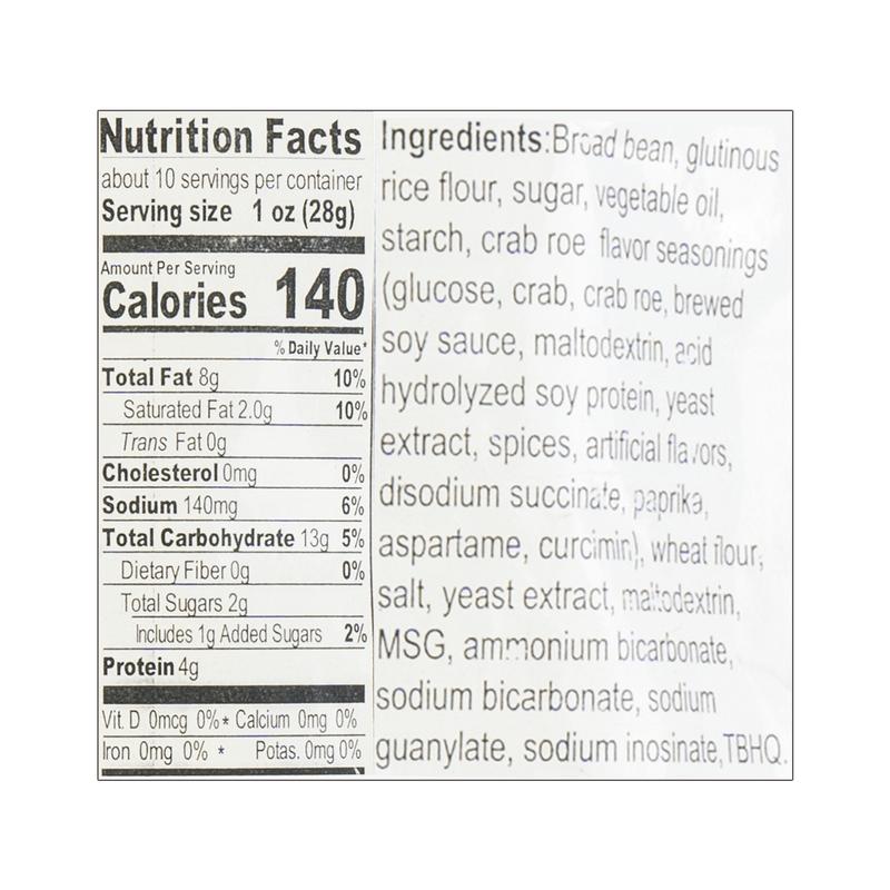 ·Broad Bean, Palm Oil, Glutinous Rice Flour, Sugar, Corn, Starch, Crab Roe Flavor Seasonings(Glucose, Crab, Crab Roe, Brewed Soy Sauce, Maltodextrin, Acid Hydrolyzed Soy Protein, Yeast Extract, Spices, Artificial Flavors, Disodium Succinate, Paprika, Aspartame, Curcimin), Wheat Flour, Salt, Yeast Extract, Maltodextrin, MSG, Ammonium Bicarbonate, Sodium Bicarbonate, Sodium Guanylate, Sodium Inosinate.