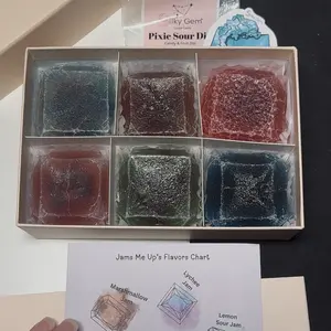 Indulge in the jam-packed flavors of the Silky Gem Jams Me Up Collection. This special assortment features six handcrafted crystal candies with crisp, delicate exterior that reveal luscious jam-filled centers. Beneath the exterior, each piece holds a firm, jelly-like texture that delivers a satisfying bite along with a burst of fruity sweetness.