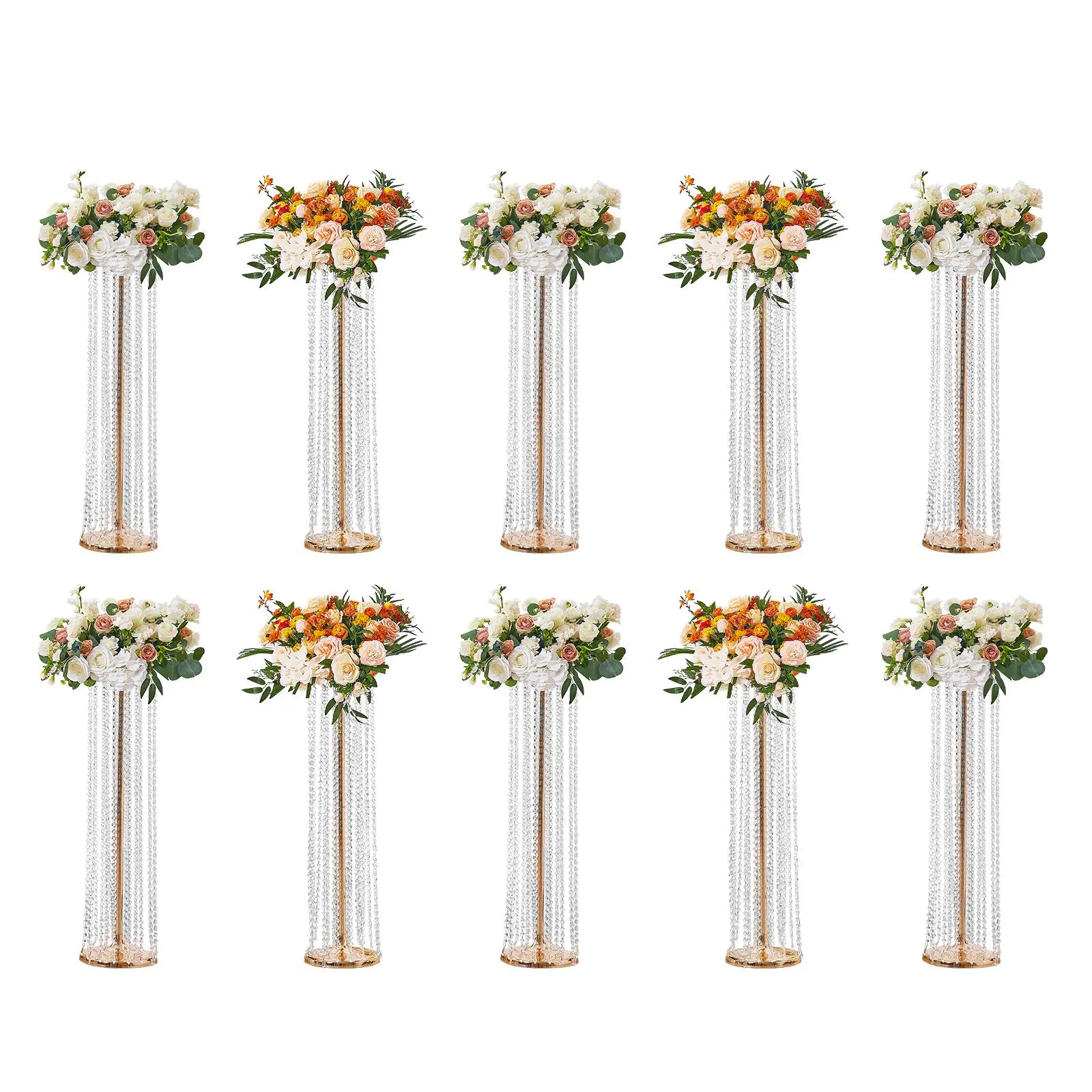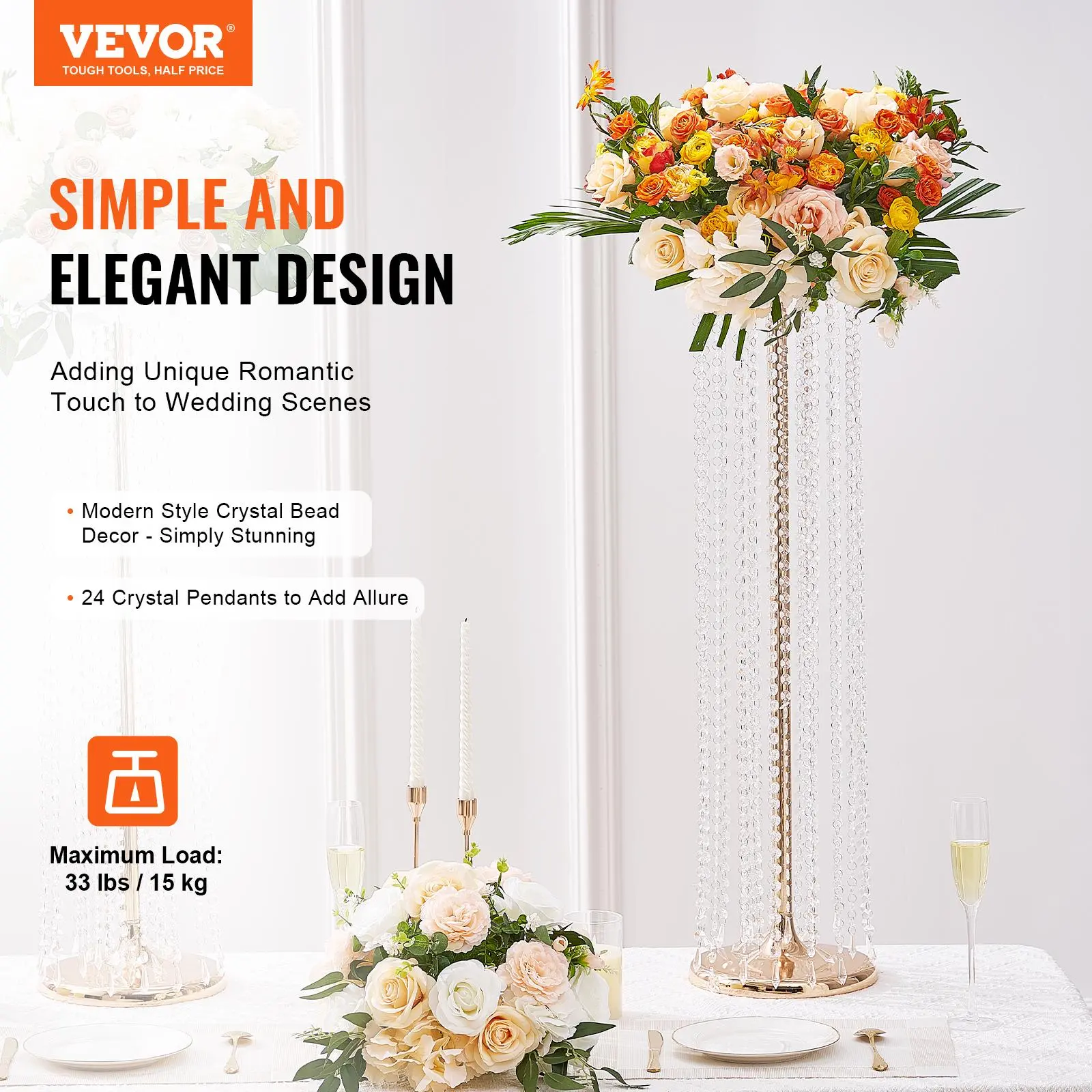 • Elegant Design: This crystal flower rack features a modern style adorned with crystal beads, double rings of crystals, and 24 crystal pendants, creating a magnificent and elegant look. It ensures even weight distribution, enhancing overall stability, with a maximum load capacity of 33 lbs, making it suitable for holding various decorations without the risk of falling.