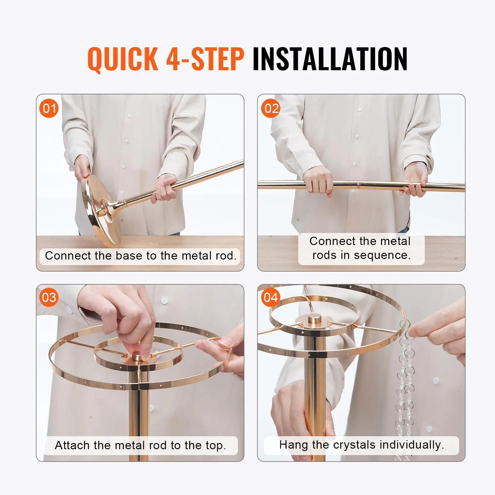 • Easy Assembly: Assembly of this crystal flower rack is simple and tool-free, requiring just four steps: Step 1 - Connect the base with the metal rod, Step 2 - Assemble the metal rods in sequence, Step 3 - Connect the metal rod with the top, Step 4 - Attach the crystals individually. Assembly can be completed in just a few minutes.