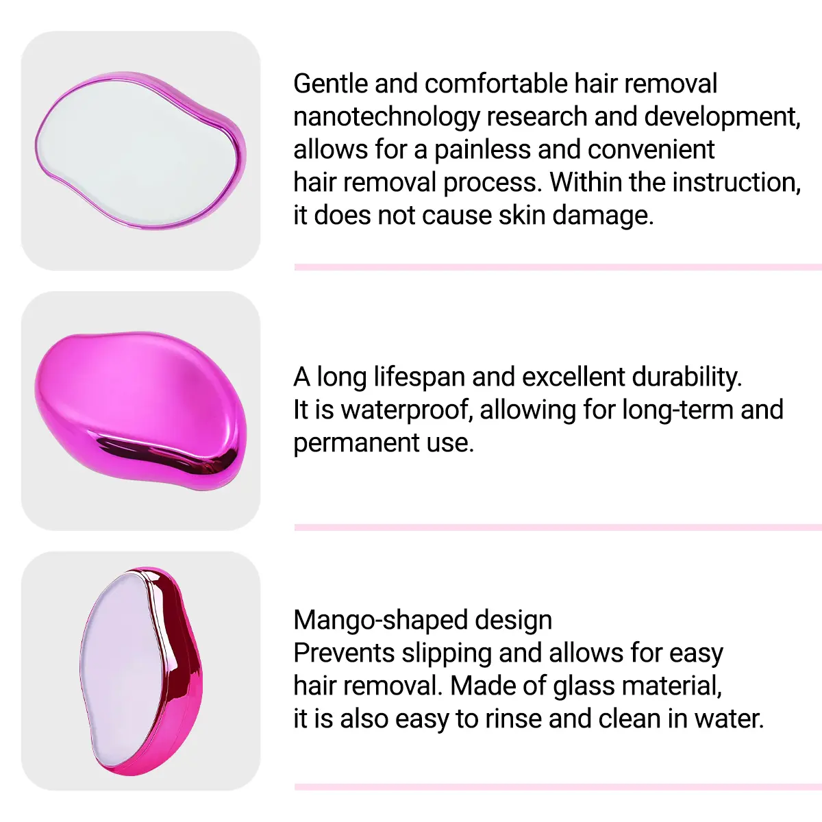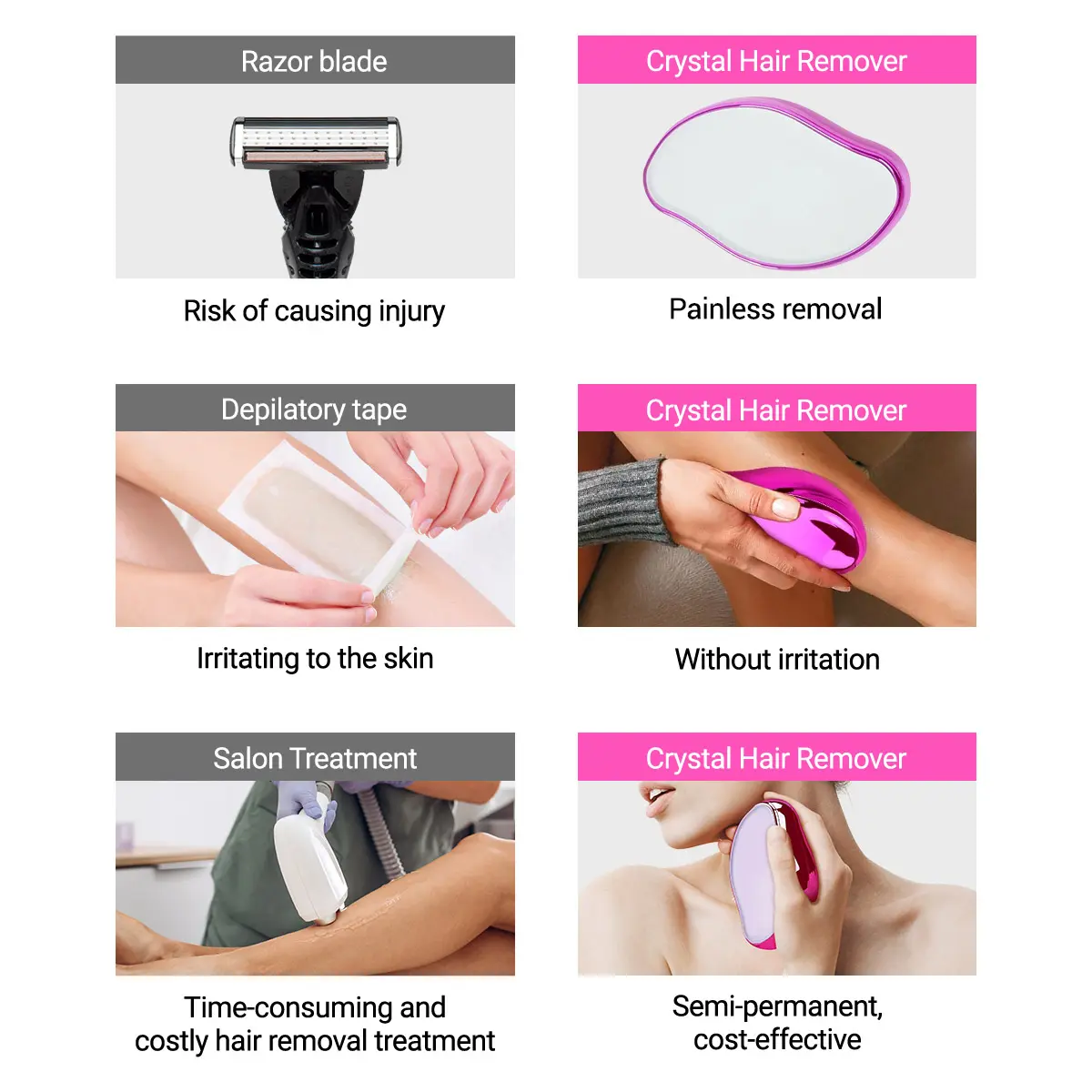 If you're tired of razor cuts, painful waxing, or expensive lasers. Our Crystal Hair Eraser is made of premium ABS materials, with a smooth, safe, and reliable surface. Nanotechnology Crystal Hair Eraser exfoliates dead skin, improves skin tone, and does not hurt the skin. Our Crystal Hair Eraser is a good choice!