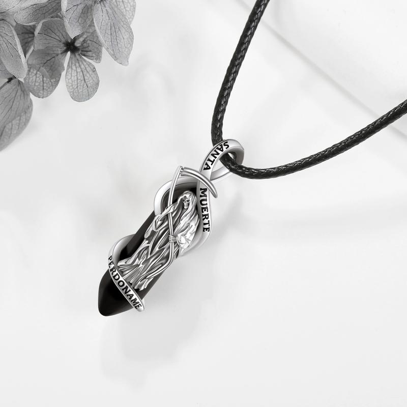 Design:Santa Muerte Necklace symbolizes love, good health, fortune, healing, protection. Santa Muerte is often depicted as a skeletal figure, similar to the Grim Reaper, wearing a robe and holding a scythe. Devotees of Santa Muerte believe that she can provide protection, healing, and assistance in various aspects of life