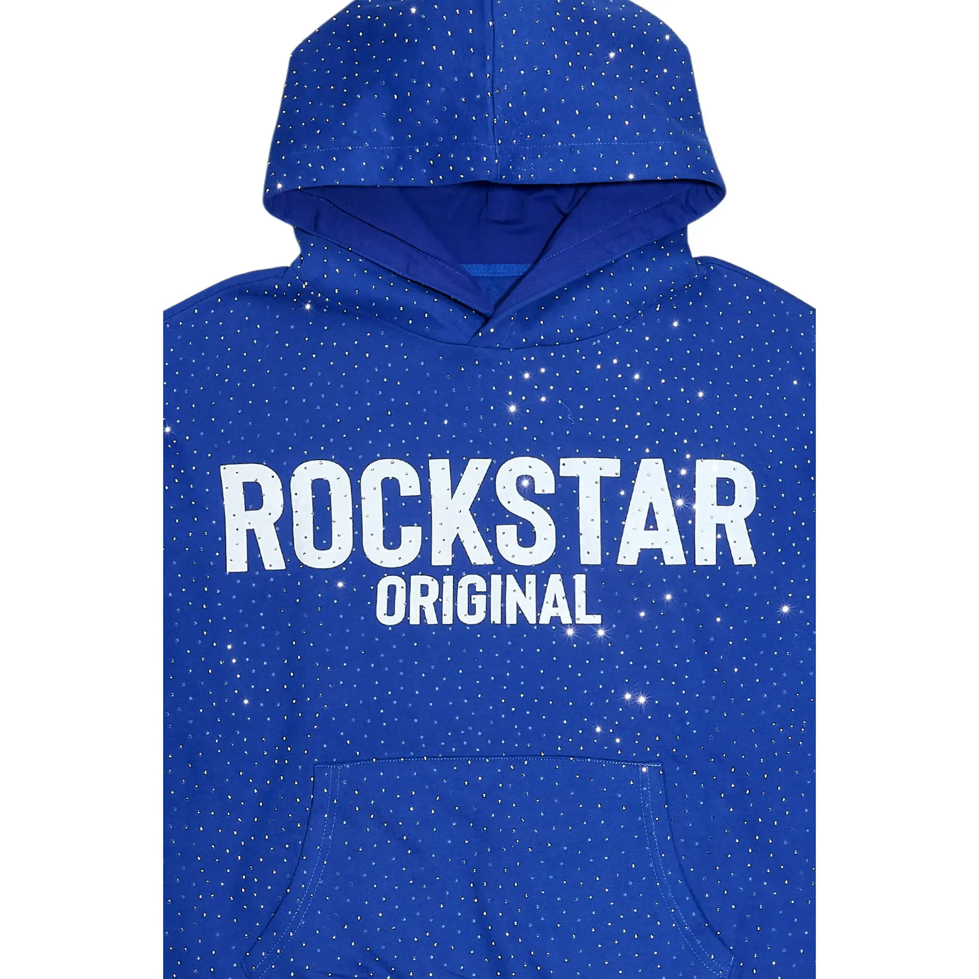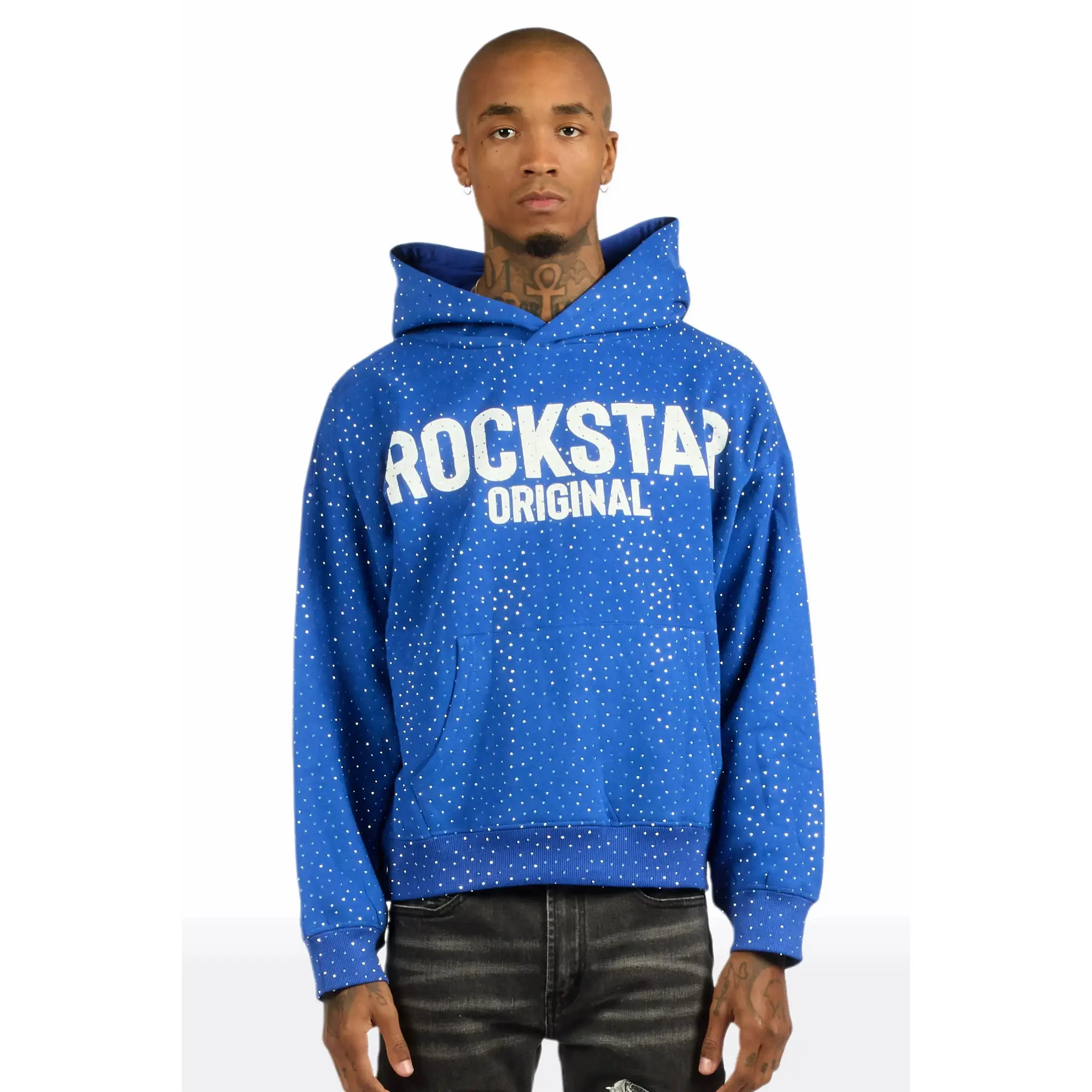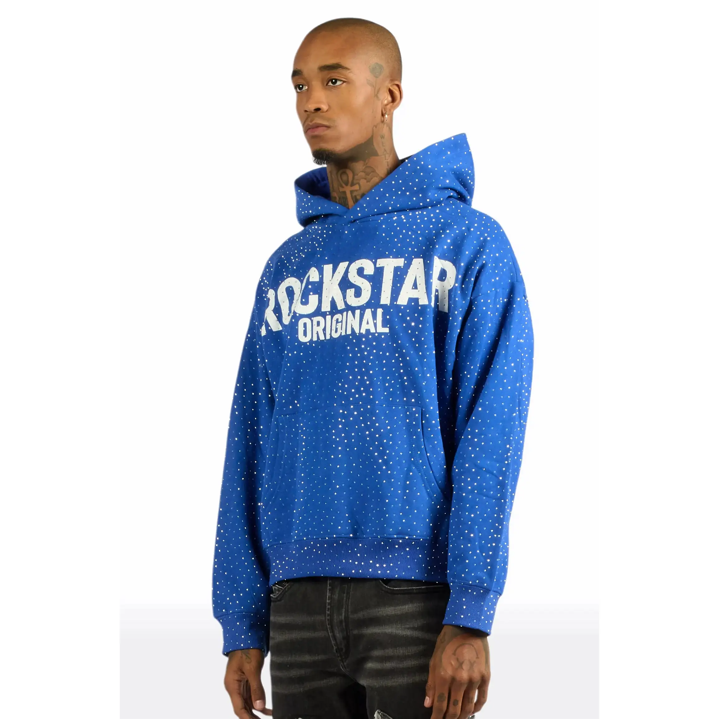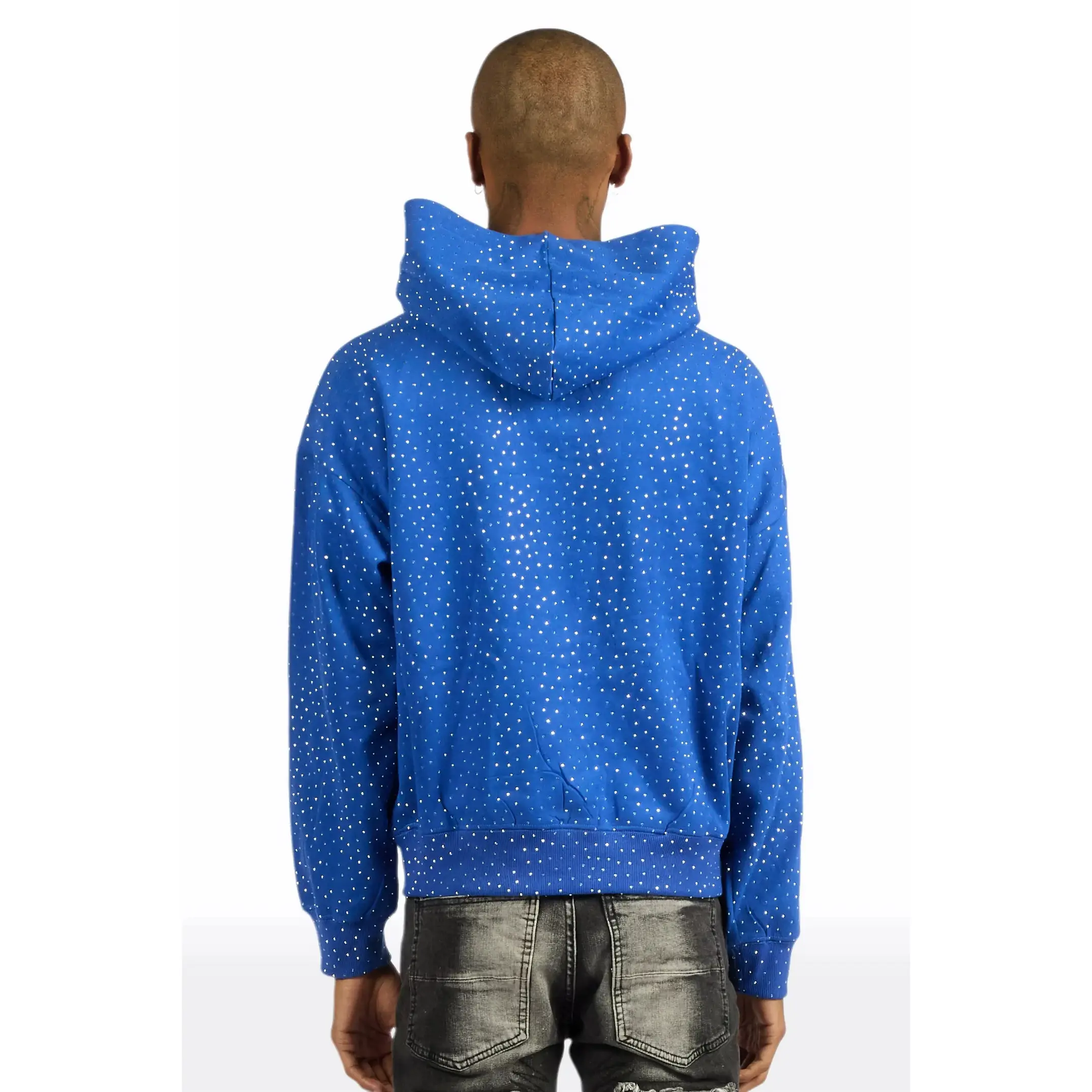 An urban hoodie for men in royal blue. Designed with ultra soft organic cotton and custom rhinestone detailing for a must-cop streetwear style.