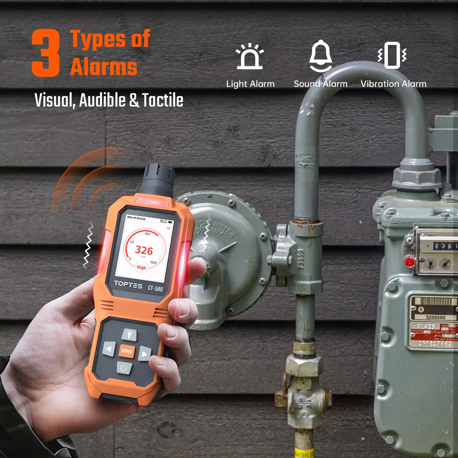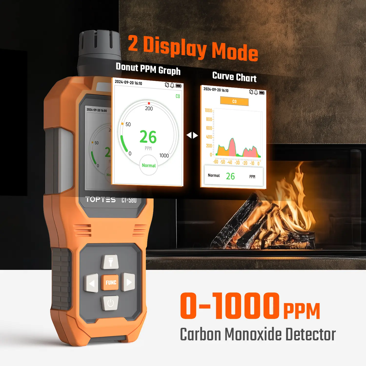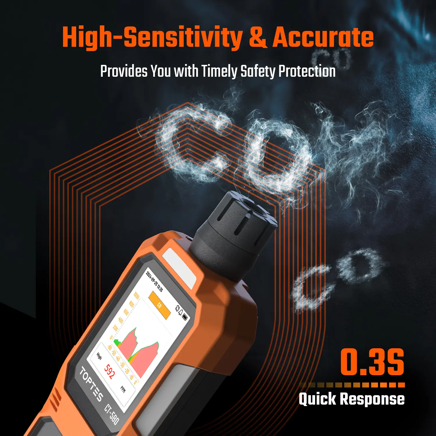 ·Fast and Accurate: The TOPTES CT-580 Carbon Monoxide Detector is equipped with ahigh-sensitivity, high-accuracy DDs sensor that provides quick response within 0.3seconds. lt can detect CO gas concentrations from 0 to 1000 PpM and features twcalarm thresholds, allowing you to quickly assess changes in your surroundings forpeace of mind