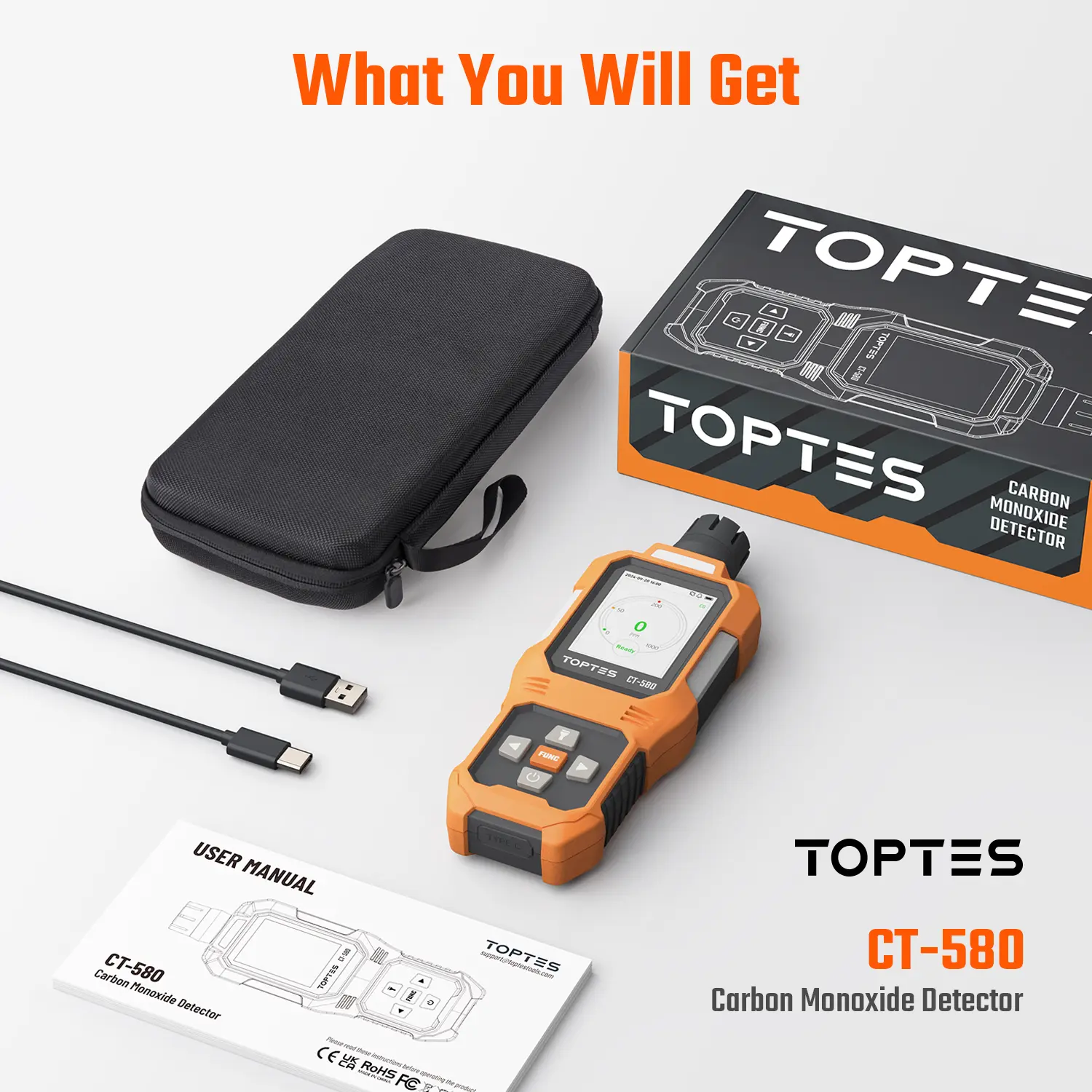 ·Certified Precision and Trusted Reliability: Certified by a national accredited lab, it is areliable and trusted handheld CO for accurate monitoring in any environment. You willreceive CT-580 Carbon Monoxide Detector, Protective Case, Type-C Charging CableUser Manual