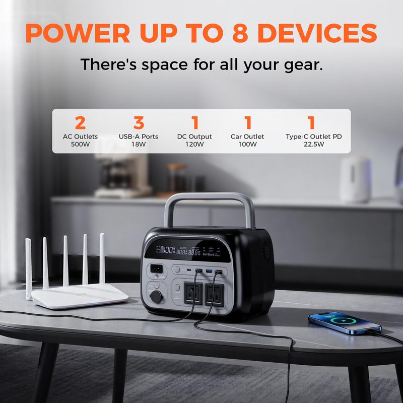🔋 With 345.6Wh capacity and 500W AC output, this generator charges phones, laptops, cameras, and drones. It features 8 output ports: 2 pure-sine wave AC, 3× QC3.0 USB-A, USB-C PD22.5W, DC, and car socket. Ideal for RVs, outdoor, and camping use.