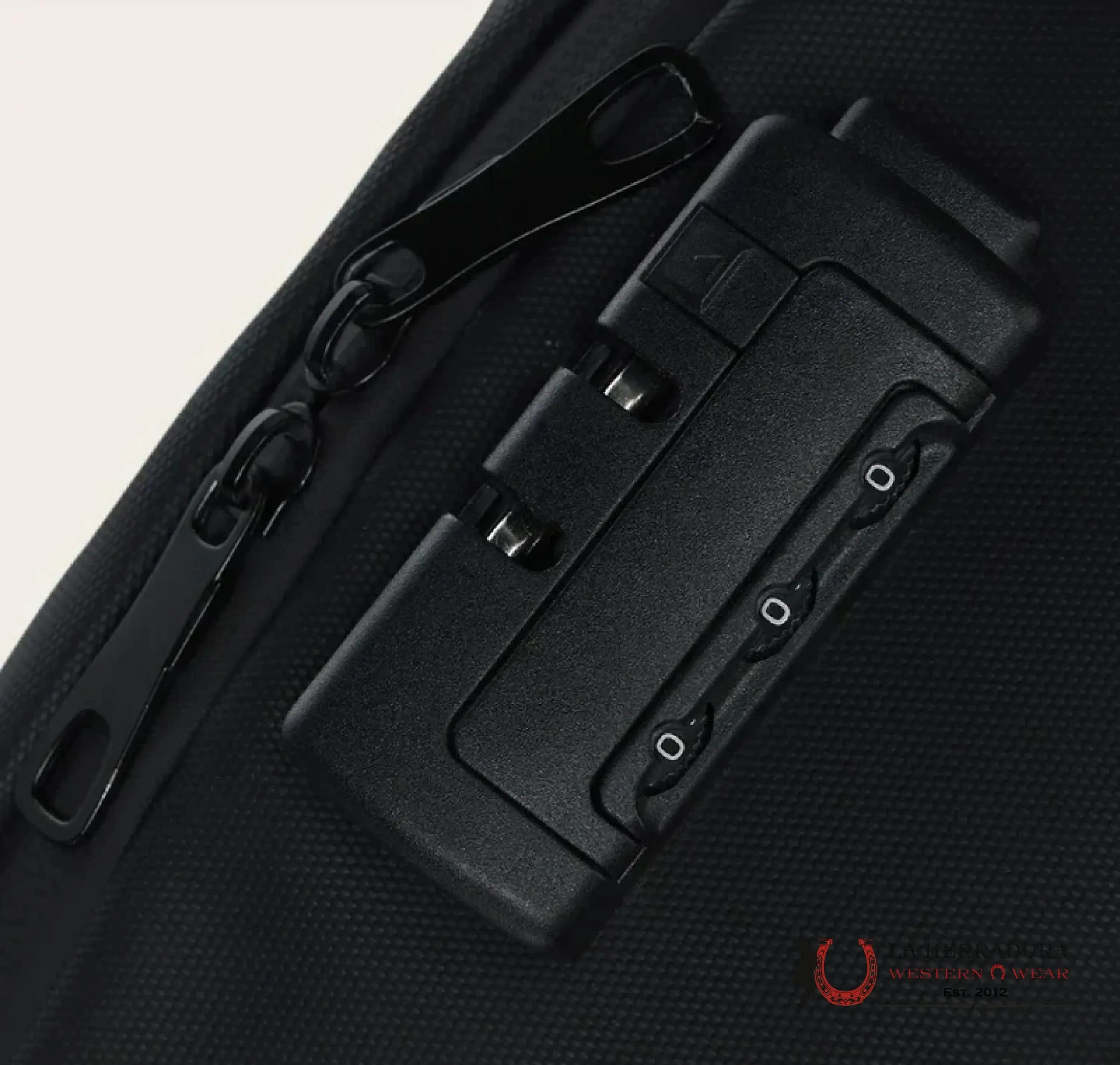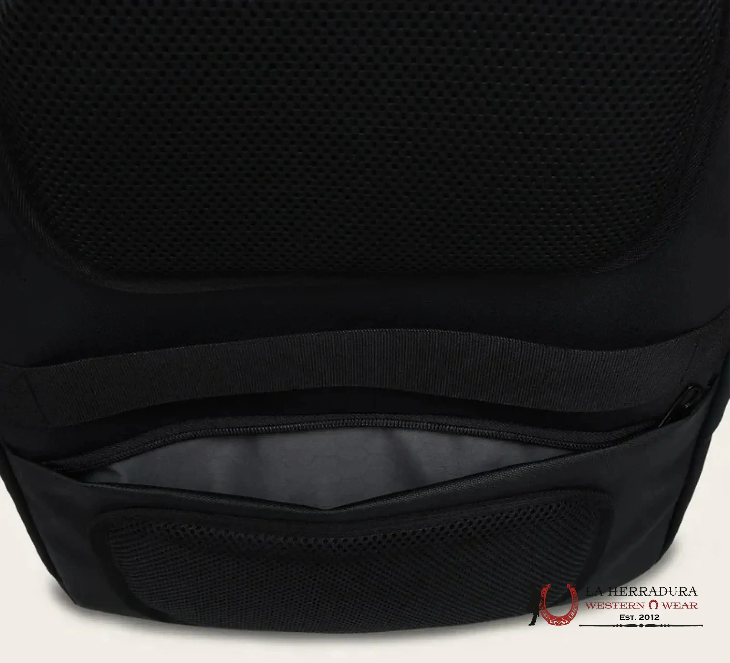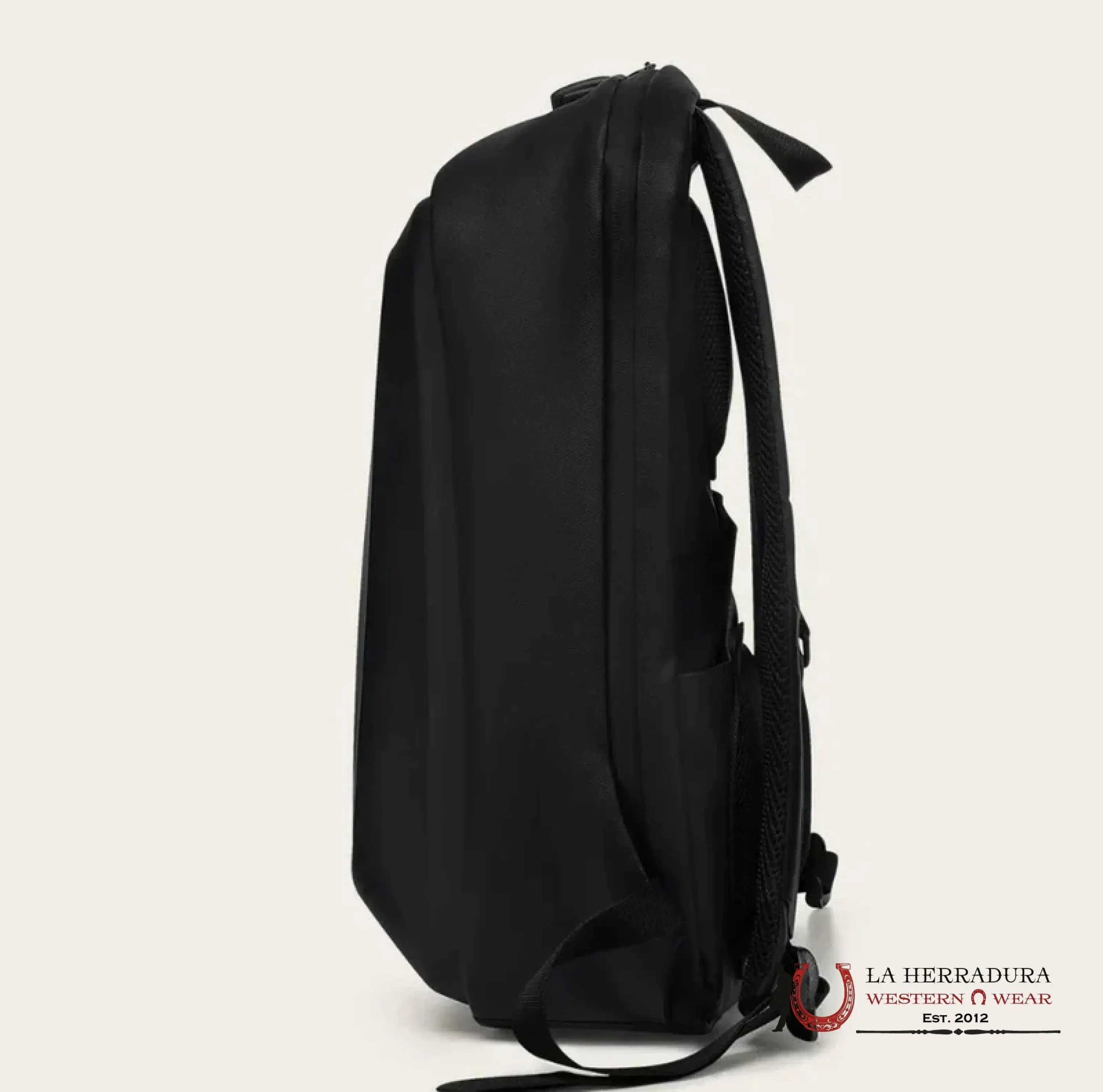 And inside it features an adjustable elastic strap to secure the hat. It includes a laptop compartment, along with functional pockets that help with organization. It has a double zipper and a safe-like security system, which includes a special section for personal information customization. The back includes adjustable shoulder straps