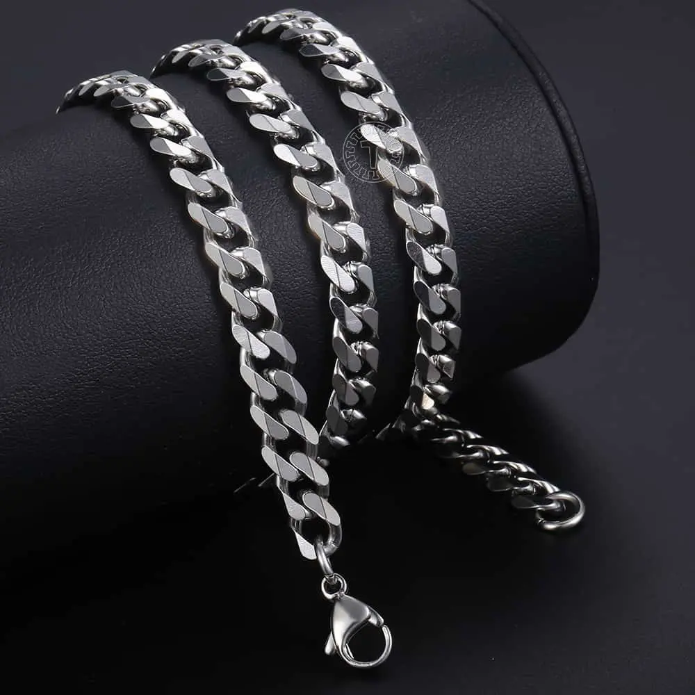 This versatile necklace comes in 3mm, 5mm, 7mm, 9mm, and 11mm widths, available in lengths from 16" to 30". Made from stainless steel, it resists tarnishing and discoloration. Perfect for both men and women, it offers a solid and heavy feel. Handcrafted for durability, it features a secure lobster clasp.