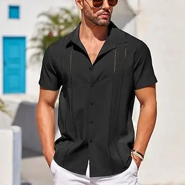 ·Cuban Guayabera Design --- Mens guayabera shirts features short sleeve, spread collar, button closure, cutout embroidery, relaxed fit. Distinct cuban design makes this shirt more fashionable and classic.
