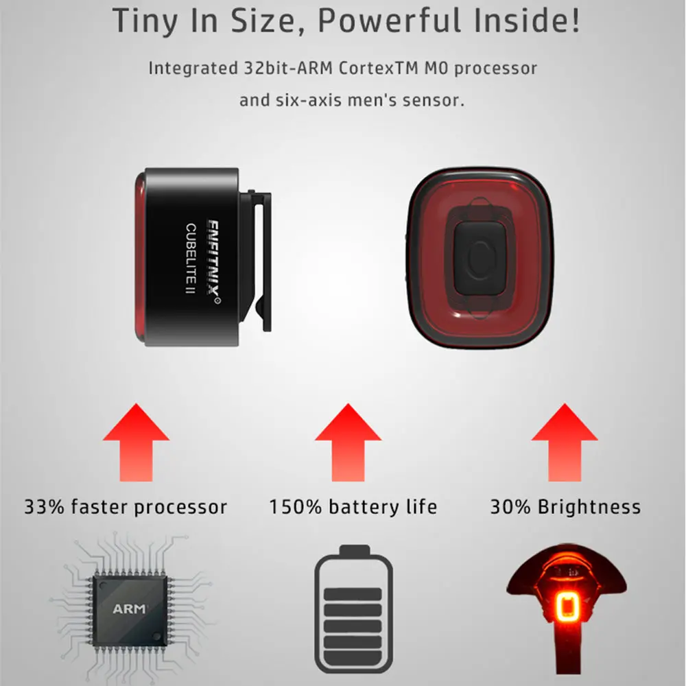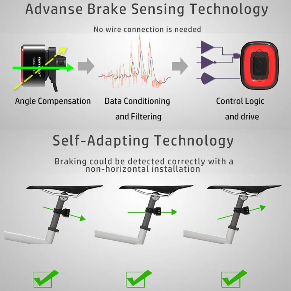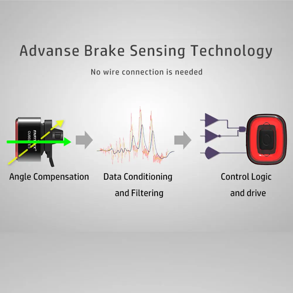 The CubeLite bike brake taillight II is integrated with a six-axis MEMS sensor (accelerometer and gyroscope) which allows the light to detect if the bike is slowing down. The additional gyroscope allows for better, reactive responses on bike angle changes and ensures more accurate braking detection.