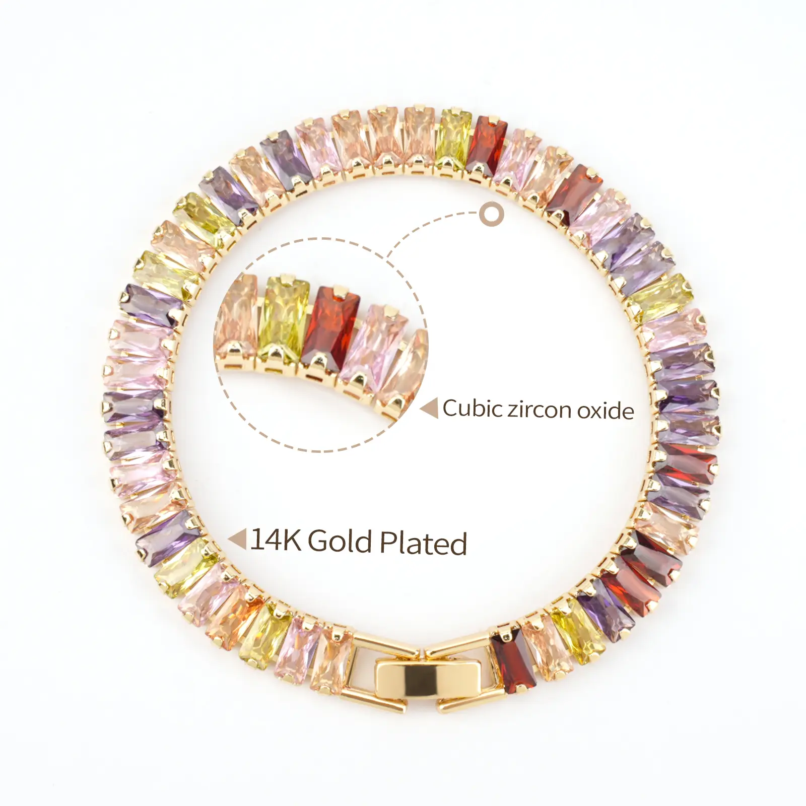 Add instant sparkle and color to your look with our dazzling 14K gold plated rainbow bracelet, featuring high-quality cubic zirconia stones in a vibrant baguette cut. Whether you're dressing up or adding a pop of shine to your daily outfit, this bracelet is the perfect accessory.