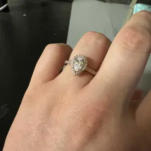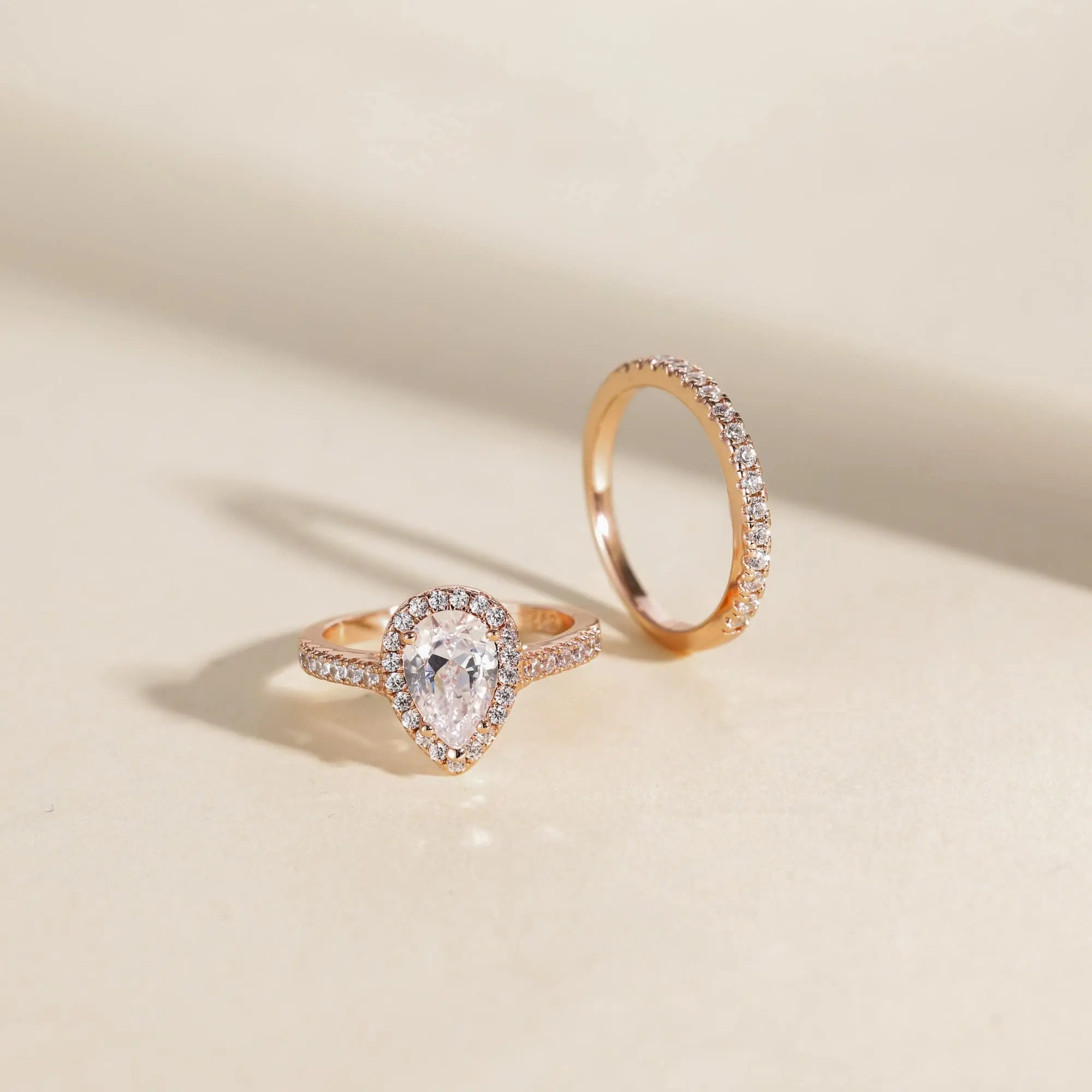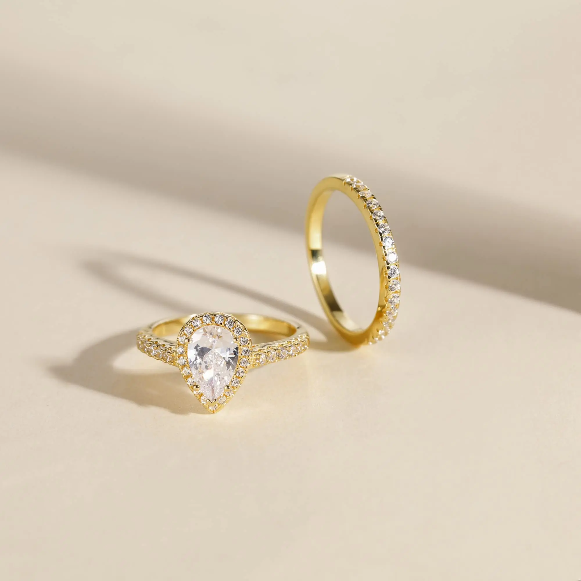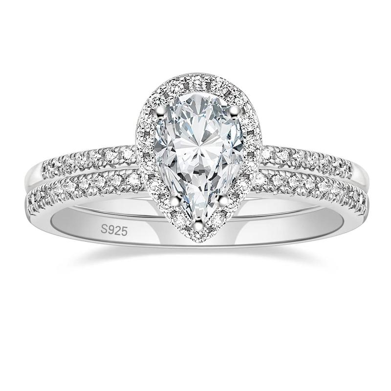 ·♥ Stylish ♥ The wedding ring set includes a 1.5 ct pear-cut halo CZ wedding band and an eternity dainty ring. This ring set has a 5-Prong-Setting craft to prevent the CZ stone fall off, and both sides of the ring features some sparkling petite CZ stone to complement the center cubic zirconia stone