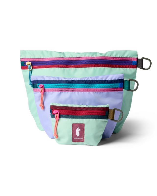 Whether you’re road-tripping somewhere for the weekend or living out of a backpack for two months, this set of three all-purpose pouches keeps you organized. They expand to hold your essentials and lay flat when not in use. These packs are made from lightweight 100% deadstock fabric with a no-fuss top zipper and D-ring for easy attachments.  Description A set of essentials-only organizers made from 100% deadstock fabric Designed for Keeping your essentials organized Trip Length Organize the essentials Carry on compatibility Accessory Features