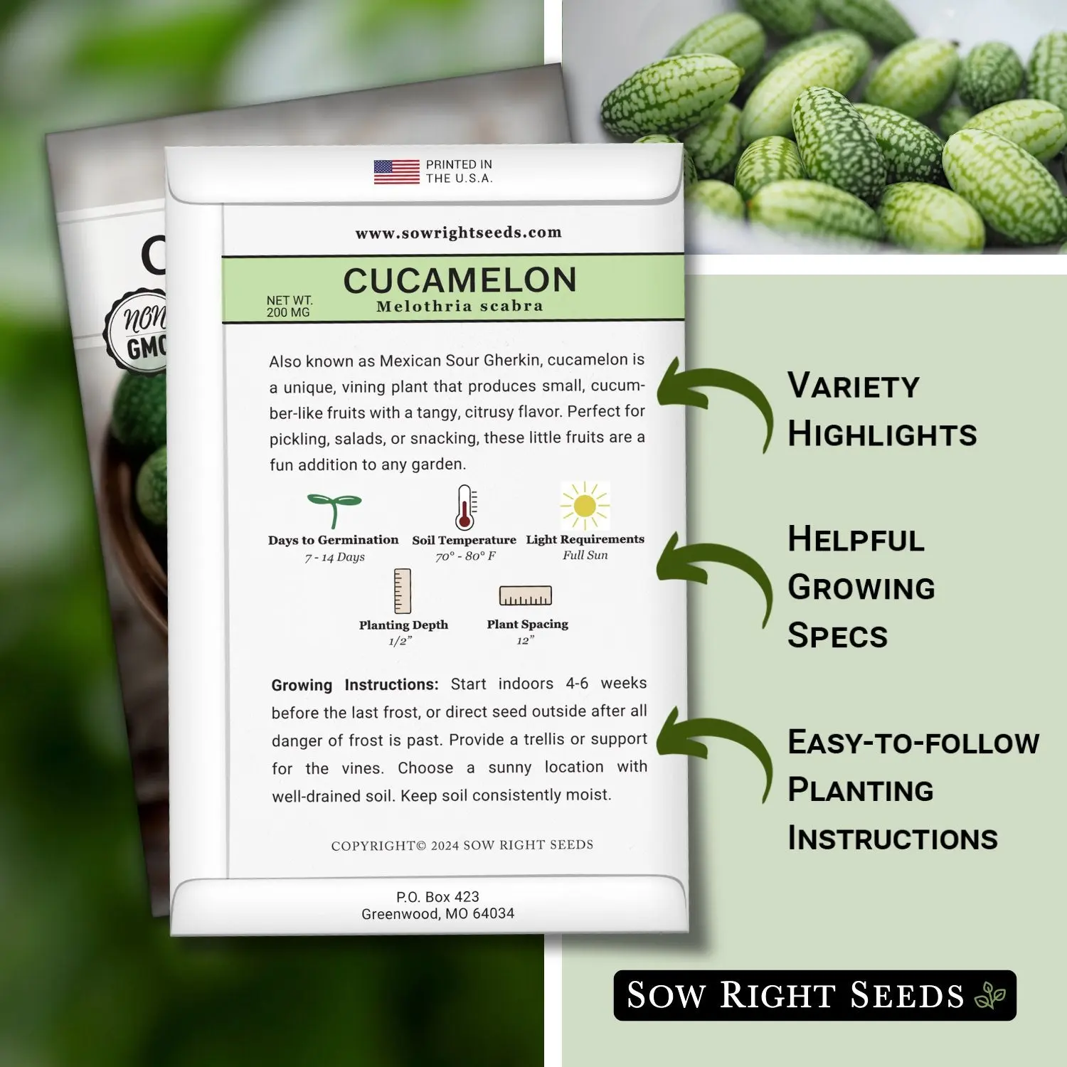 Seed packet contains 200mg (about 65 seeds). Start Cucamelon seeds indoors for early blooms - Large, premium seed packets give instructions on how to grow and when to plant outdoors.