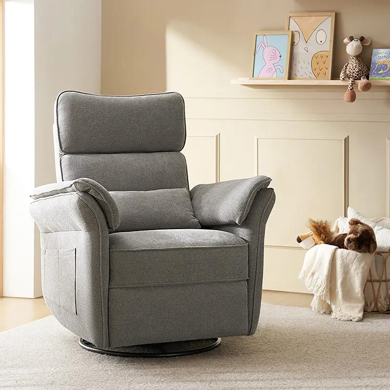 The modern electric nursery chair is designed for both mommy and baby. It offers a cozy spot for feeding, soothing, and relaxation. The 270-degree swivel rocking chair combines style and functionality. High armrests provide enhanced hand support, flipping down conveniently. An adjustable headrest ensures personalized comfort. The lumbar support guarantees back comfort during extended use.