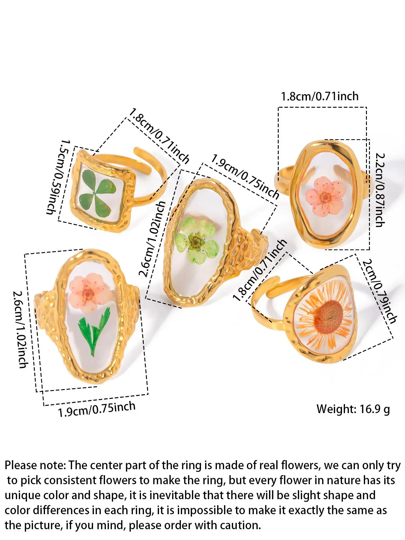 Exceptionally cute and even with my size 10 ring fingers they still are comfortable. I flowers inside acrylic is very clear and excellent quality.