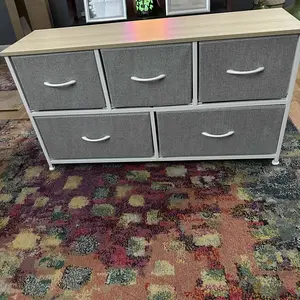 This dresser with fabric drawers saves space, perfect for storing magazines, remote controls, or children's clothing. The wooden panel at the top has a load-bearing capacity of up to 66 pounds, suitable as a TV stand. The full size is 38"L x 11.81"W x 20.87"H.
