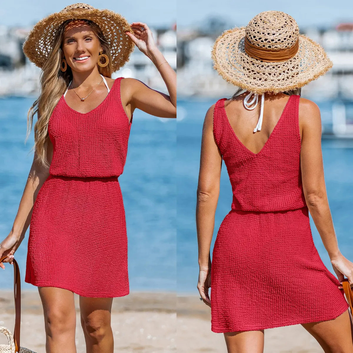 The open-knit design is slightly see-through, especially in light colors. Best worn over swimwear or with a light layer underneath. Chase the sun in style with the Chasing HorizonsCover-U p Mini Dress! With a flattering V-neckline, sleeveless cut, and an elasticized waist, this mini dress offers the perfect balance of comfort and effortless chic.